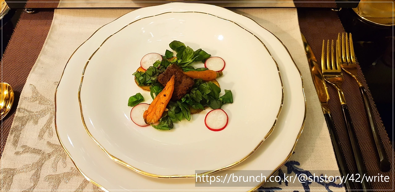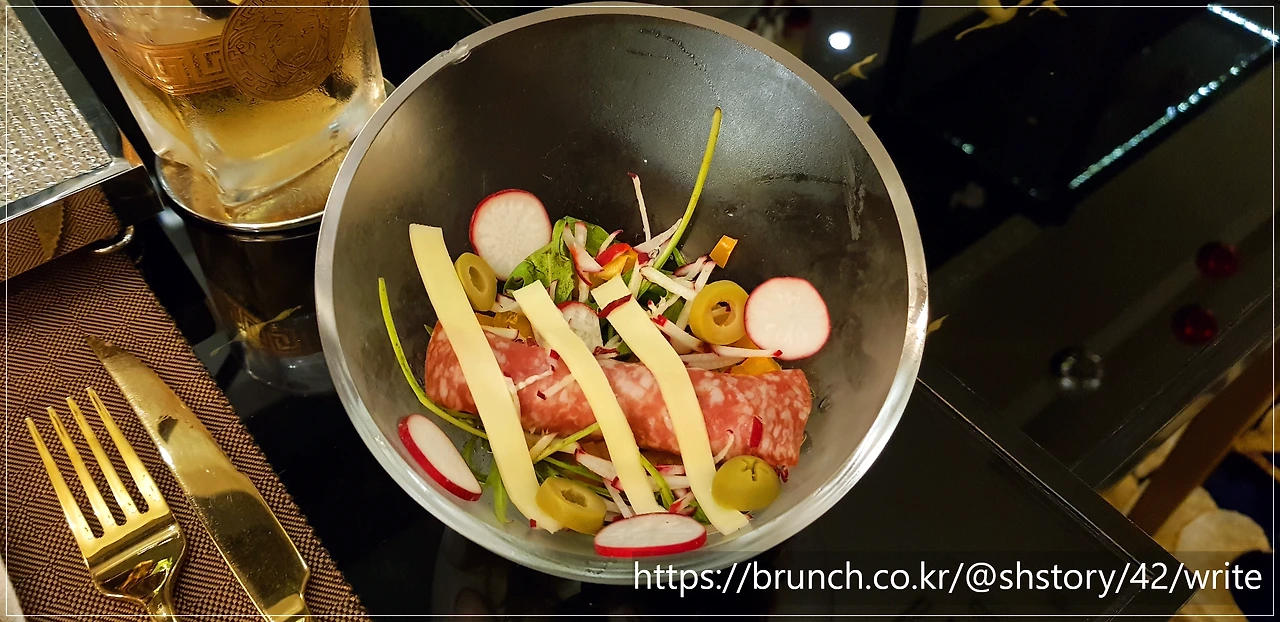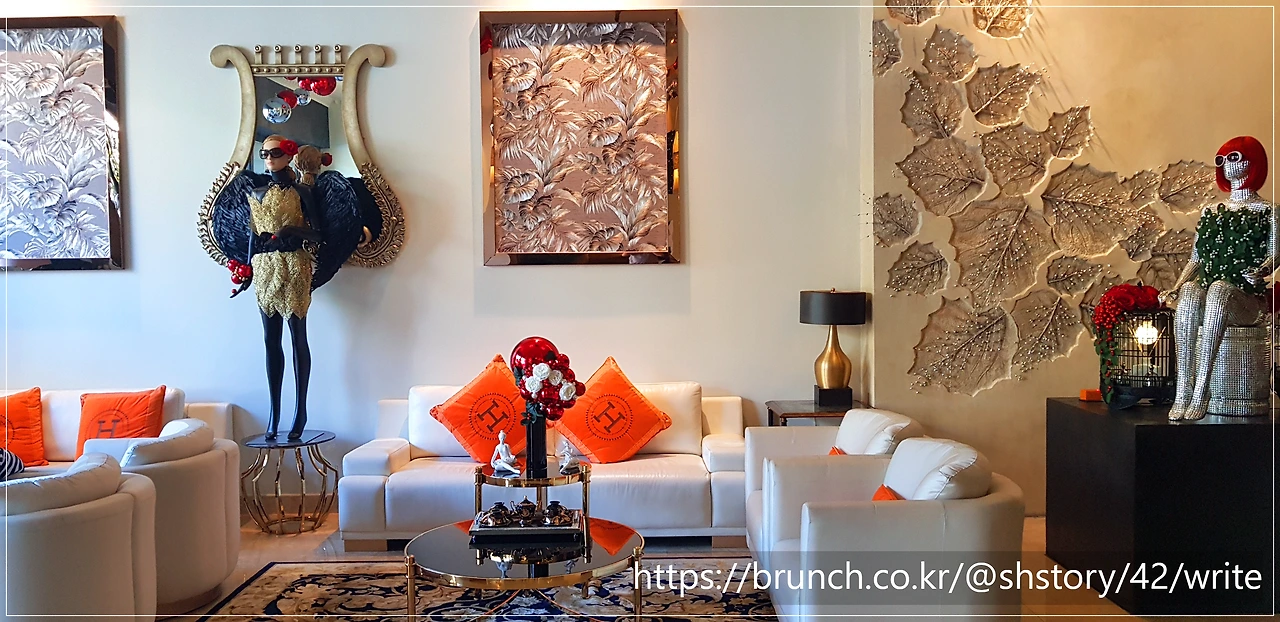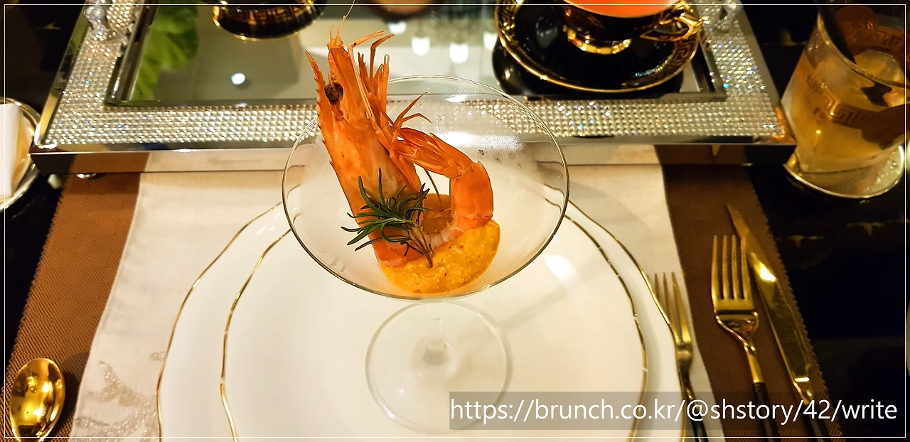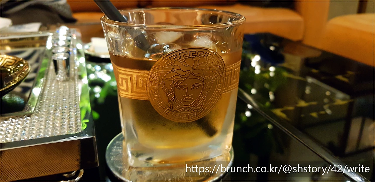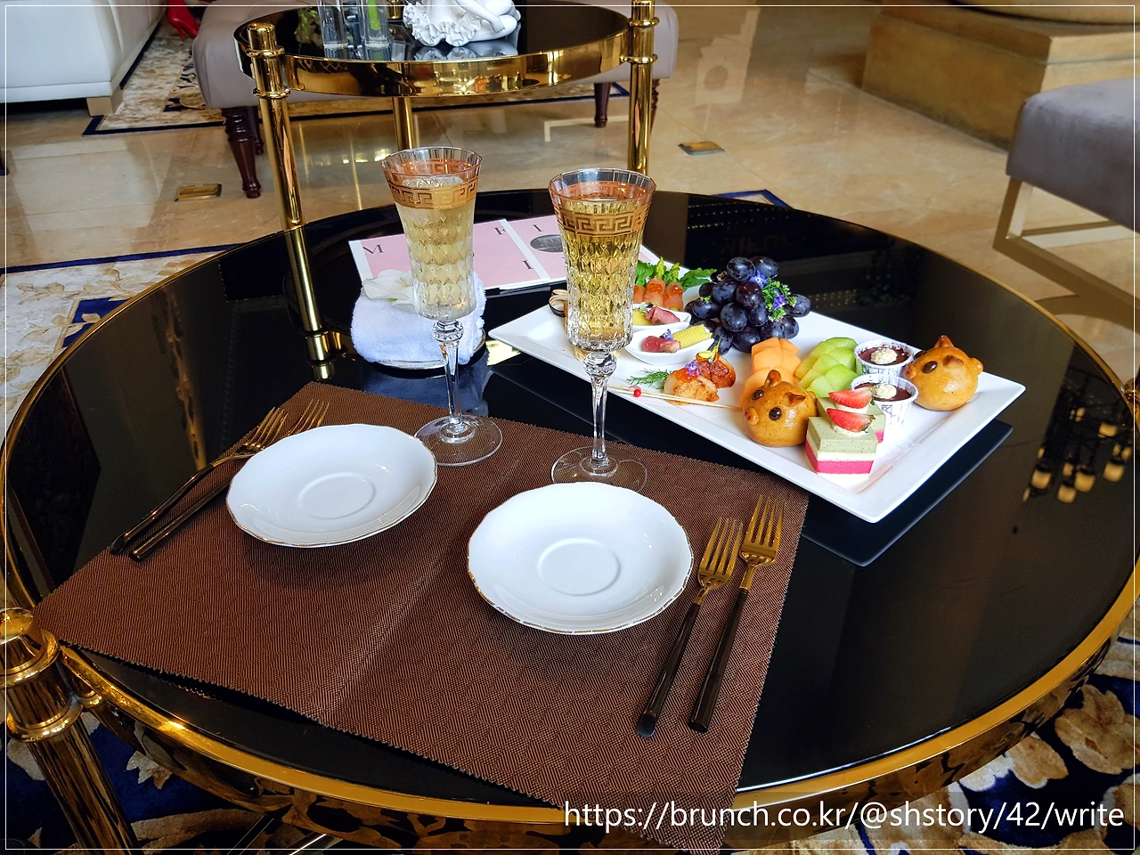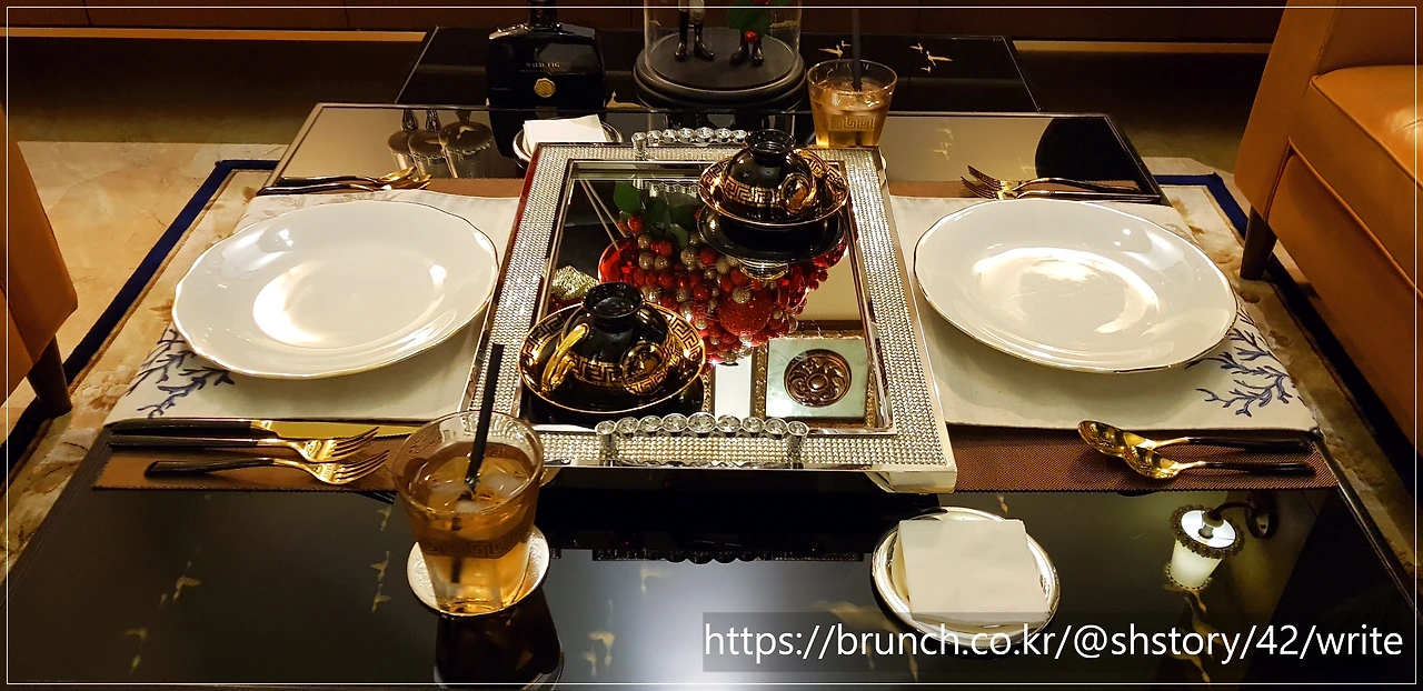우리는 다시 엘리베이터를 타고 1층으로 내려왔다. 그리고 처음 들어왔던 그 로비 라운지로 돌아왔을 때, 우리는 동시에 멈췄다. 테이블 위에는 이미 준비된 식사 세팅이 기다리고 있었다. 천 냅킨과 크리스털 컵, 버터나이프가 포함된 정갈한 커트러리, 골드 림 플레이팅 디쉬, 준비된 핑거푸드 트레이, 그리고 베르사체 티 세트에 담긴 티.