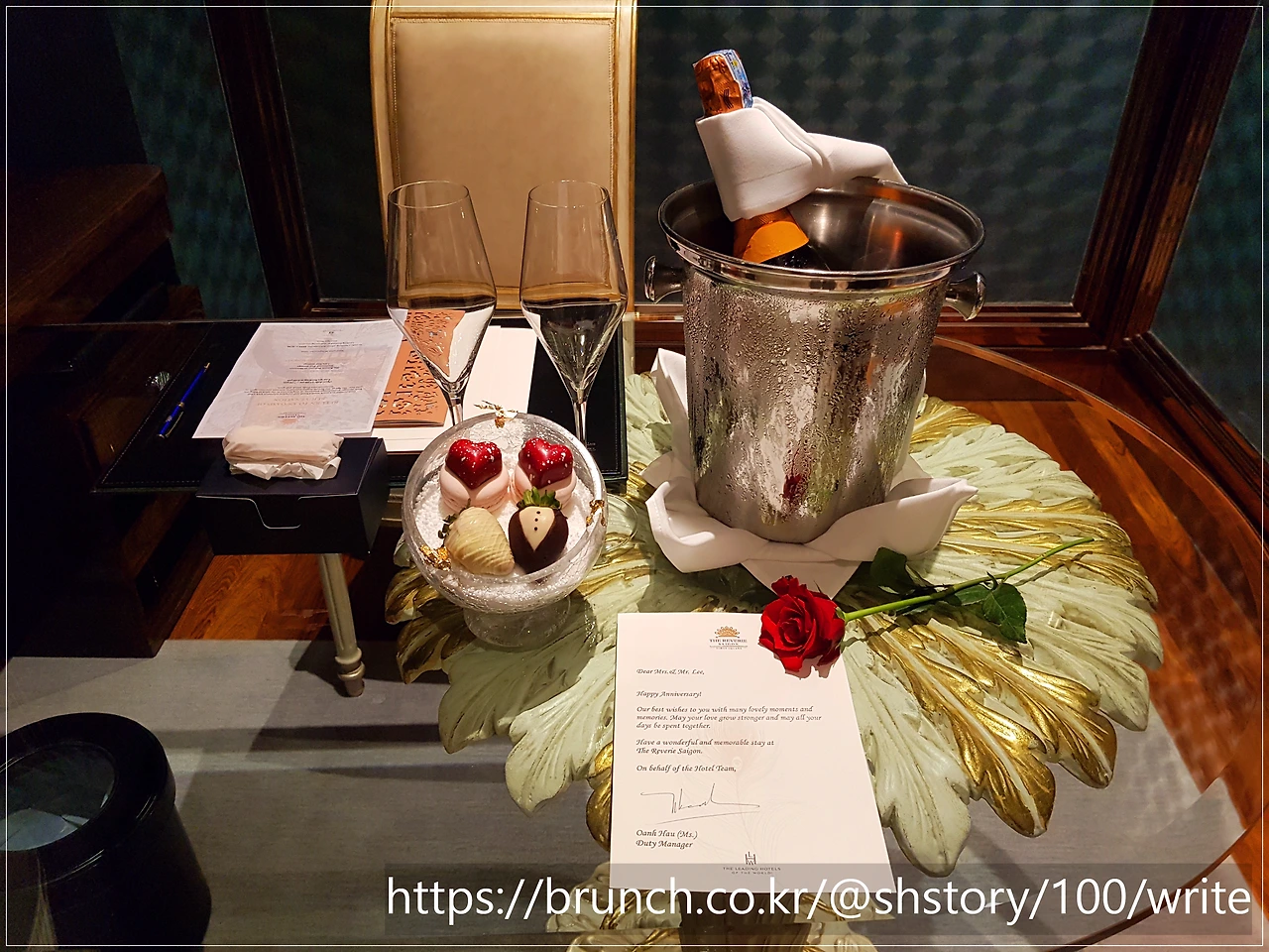 아내가 데스크를 가리켰다. 얼음 통에 담긴 샴페인 한 병, 장미 한 송이와 초콜릿. 그리고 쪽지 한 장.