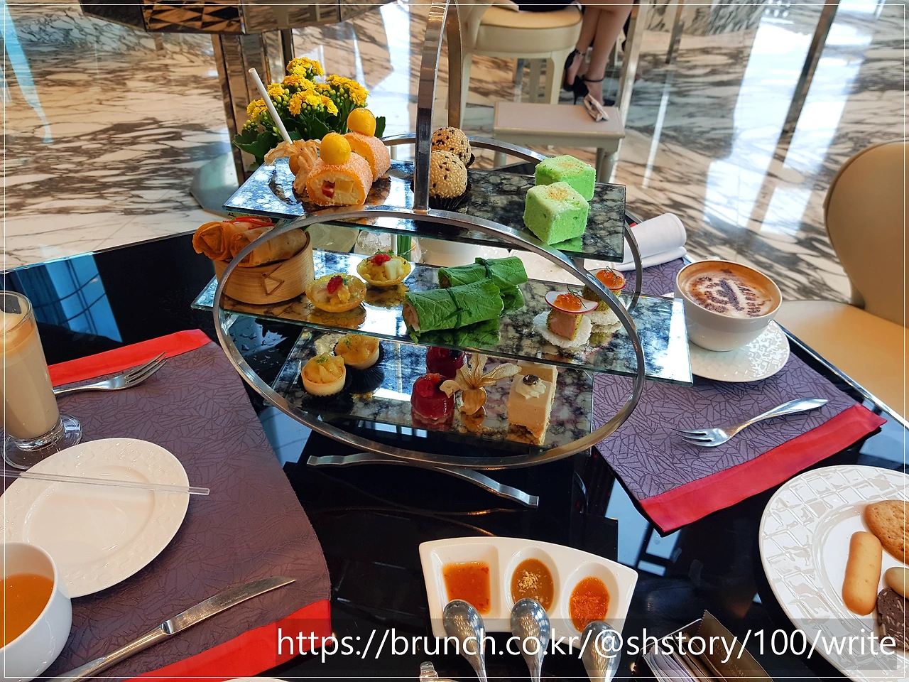 시선의 끝에, 아내가 미소 지으며 찻잔을 들고 있었다. 집에서는 늘 무언가를 챙기느라 바빴던 아내의 손이, 이곳에서는 오롯이 찻잔만을 들고 우아하게 움직이고 있었다. 은빛 3단 트레이 위에는 망고, 코코넛, 패션후르츠 등 동남아의 햇살을 머금은 디저트들이 놓여 있었다.