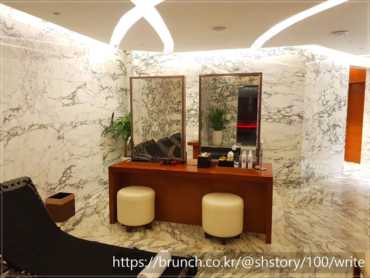 스파와 연결된 통로 끝, 문 하나를 사이에 두고 분위기가 달라졌다. 음악이 사라지고 라탄 소재 대신 차가운 대리석이 등장했다. 락커룸은 예상보다 크지 않았지만 질서가 있었다. 한 치의 흐트러짐 없이 정돈된 나무 락커 안에는 접혀있는 타월과 케어 키트가 완벽하게 동일한 구성으로 놓여 있었다. 화장대에는 L'OCCITANE(록시땅) 어메니티와 제형 도구가 차분히 배열되어 있었다. 관리받은 사람이 스스로를 다시 정돈할 수 있는 여백. 그것은 배려라기보다 마무리의 품질에 대한 집요함이었다.