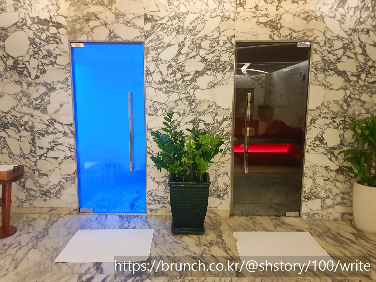 스파 베드를 떠나 아내는 파우더룸으로, 나는 사우나로 향했다.