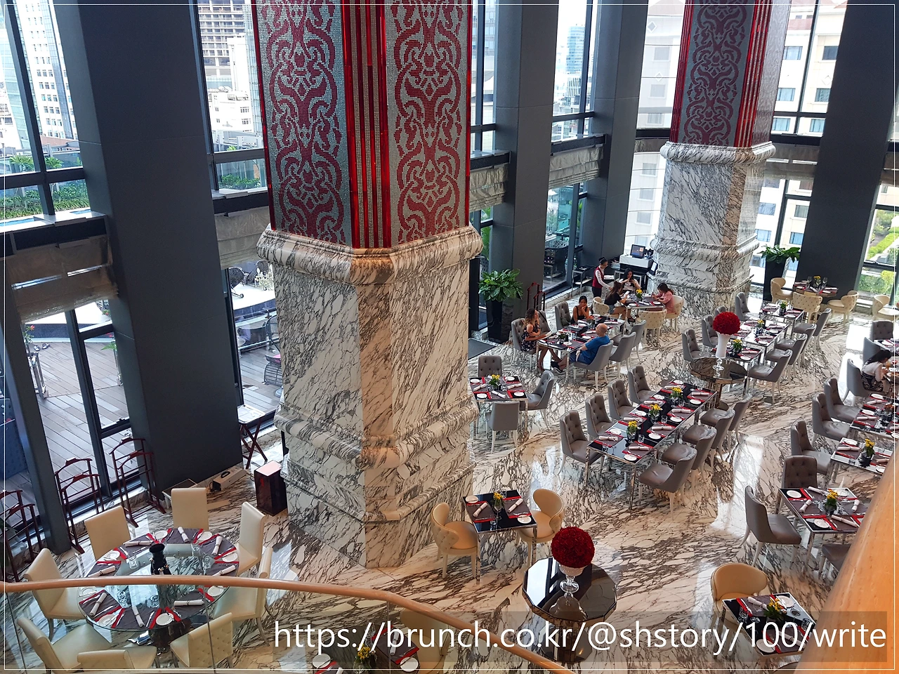 계단을 다 내려오는 순간 거대한 공간이 열렸다. 복층 전체가 뚫려 있어 시선이 수직으로 확장되었고, 대리석 패턴이 물결처럼 이어진 바닥이 시야를 가득 채웠다. 이곳은 단순한 라운지가 아니었다. 공간이 사람을 압도하도록 설계된 '극장형 다이닝 존'이었다.