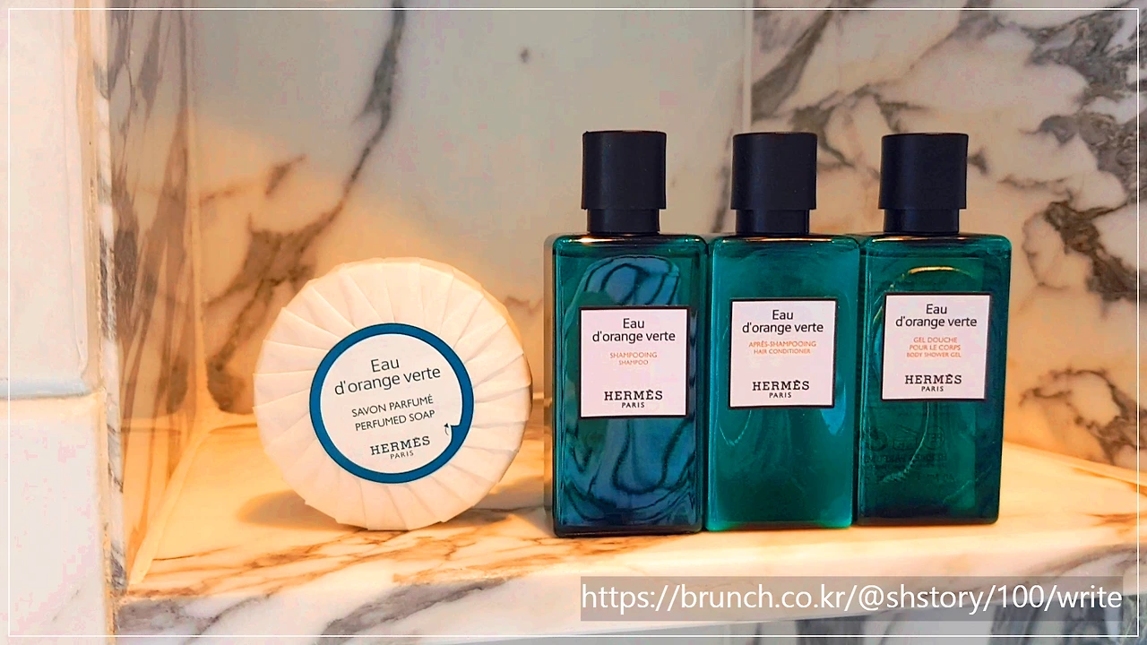 지난번 일반 객실에서 묵었을 때는 Chopard였다. 부드럽고 정돈된, 불편하지 않은 감각. 하지만 이번 주니어 스위트에는 Hermès가 놓여 있었다.
