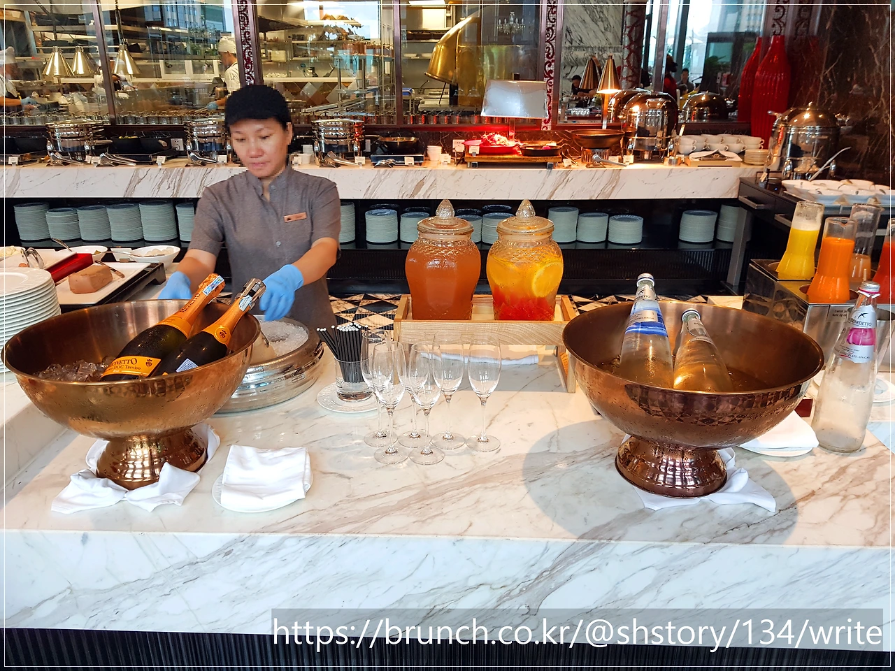 리버리의 조식 뷔페는 6개의 축(음료, 베이커리, 콜드컷, 헬시, 아시안, 온요리)으로 구성된다. 나는 서두르지 않고 콜드컷, 치즈, 피클을 접시에 담아 샴페인을 곁들였다. 이 순간 비로소 하루가 깨어난다.