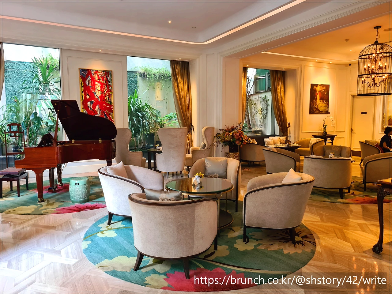 문을 열고 들어서면, 벽에는 전통 복식의 초상화가 걸려 있고 천장에는 새장 모양의 샹들리에가 빛을 흩뿌린다. 회색 가죽 소파 위로는 오후의 햇살이 부드럽게 내려앉고, 로비는 미술관이자 라운지처럼 고요하게 숨 쉰다.