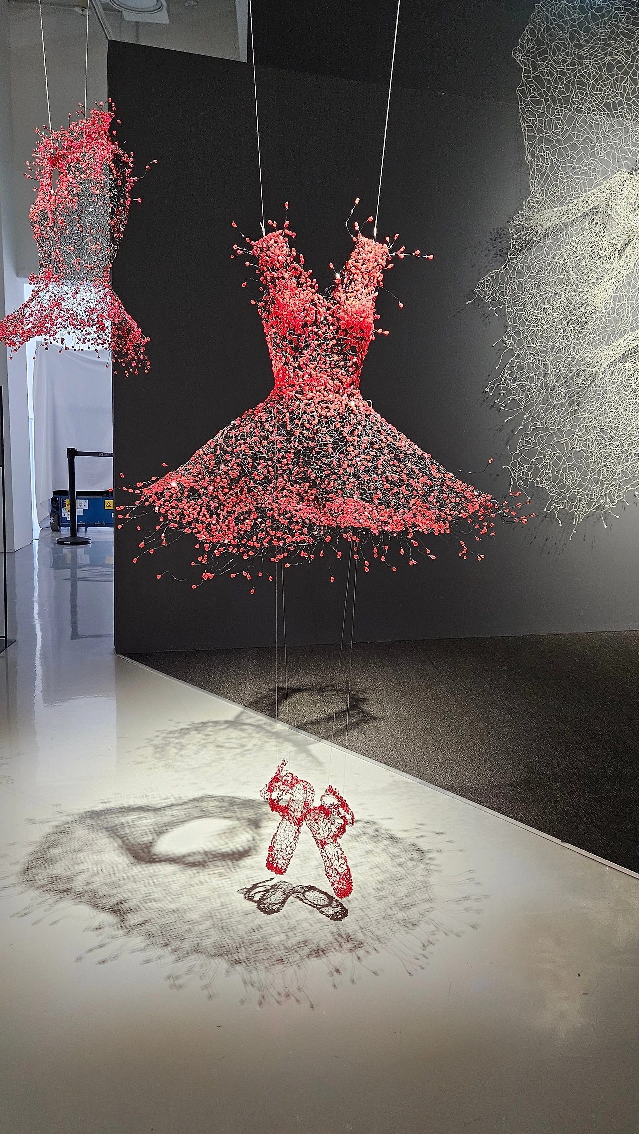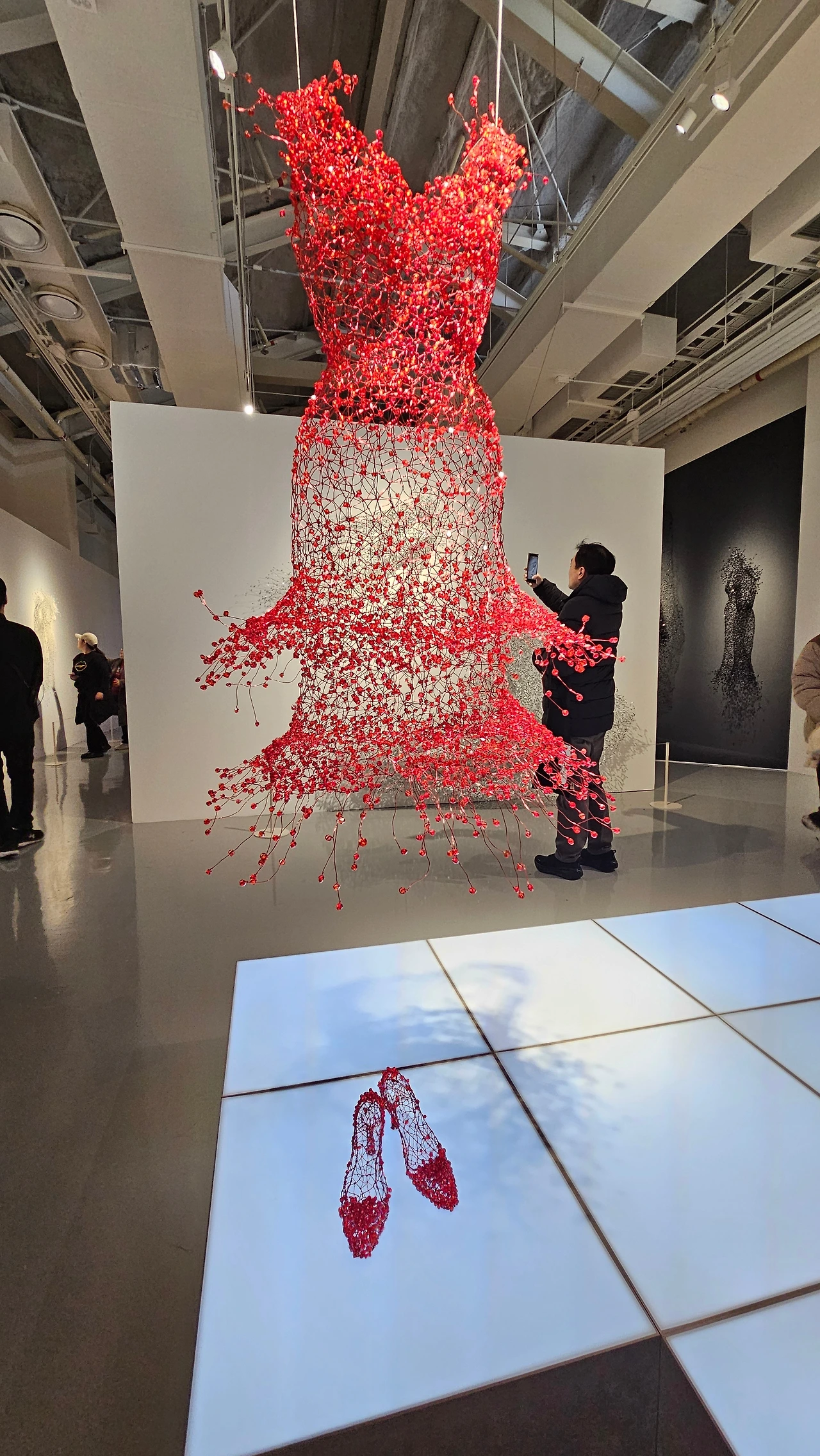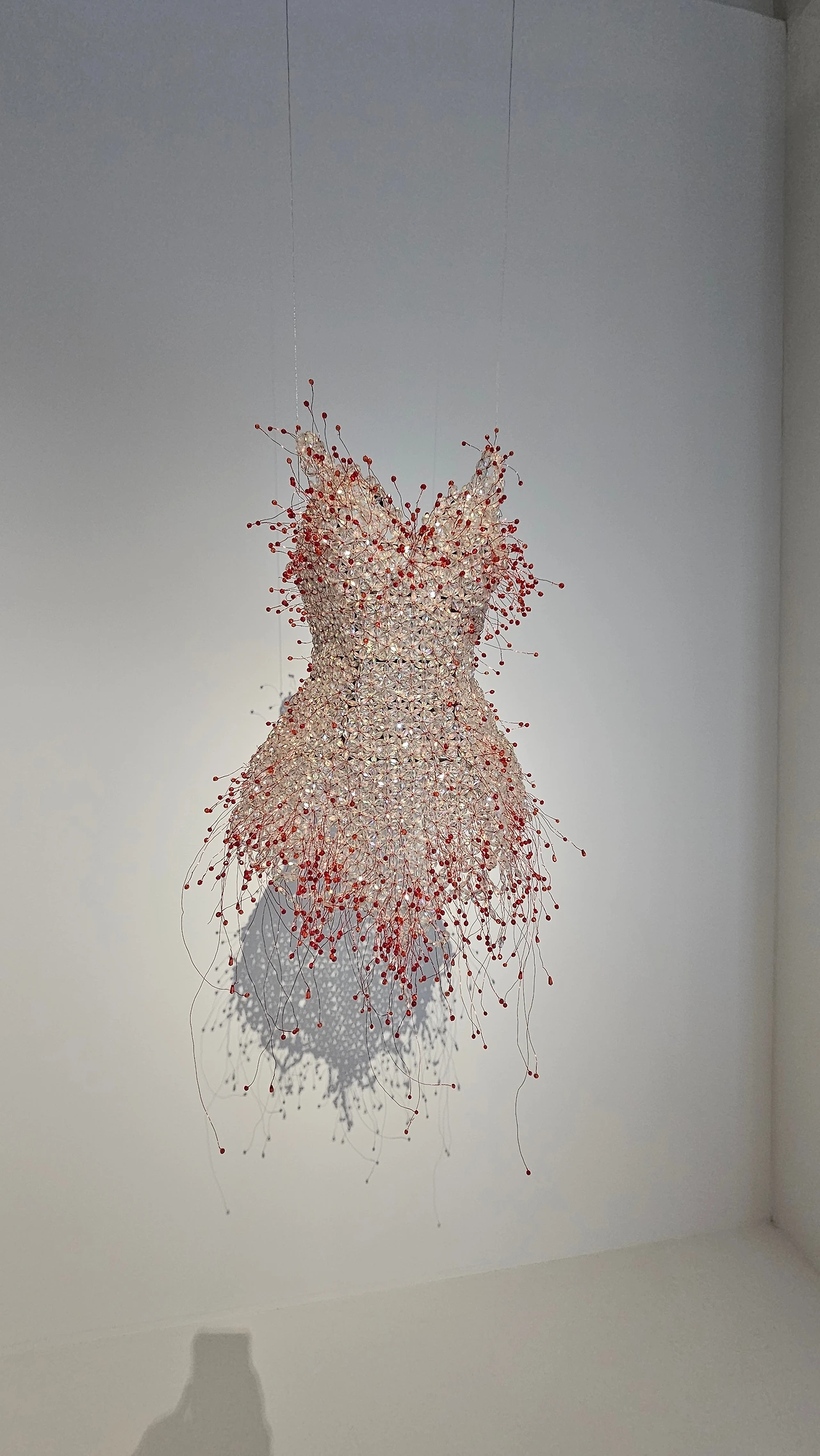 철사와 구슬, 선과 매듭이 만들어내는 구조가 빛과 그림자를 타고 공간까지 번져나간다. 벽 앞에 서 있는데 작품이 나를 감싸는 느낌이었다.