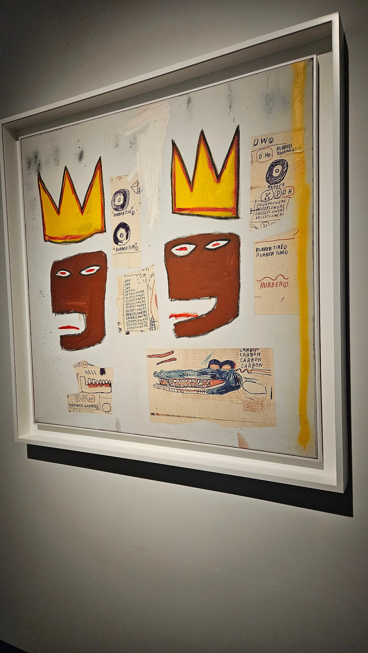 그런데 시선을 아래로 내리면 분위기가 달라진다. 하단에 악어가 있다. 조용히 있다가 갑자기 덮치는, 위험한 존재. 바스키아에게 악어는 사람을 삼키는 현실이자 폭력적인 사회다. 중요한 건 위치다. 왕관을 쓴 인간의 바로 아래에 악어가 있다는 점.