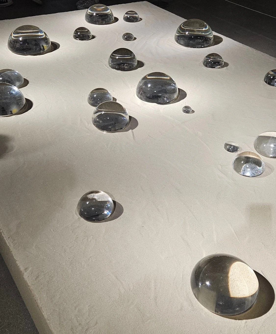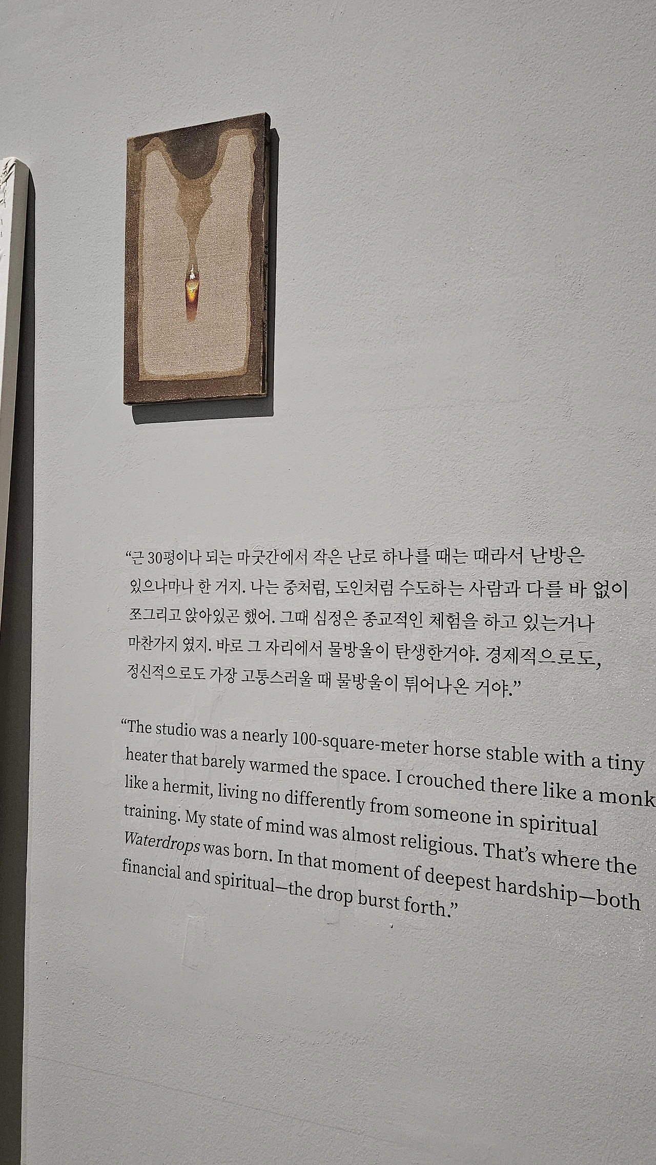 나는 그 앞에서 유학 시절이 떠올랐다. 한국 친구들과도, 현지인들과도 온전히 섞이지 못한 채 공부에만 매달리던 날들. 샤워 후 욕실에 맺힌 물방울을 물끄러미 바라보던 그 평범한 시간. 그가 빛과 그림자, 투명도까지 계산해 그려낸 영롱함은 나의 그 보잘것없는 순간을 예술로 건져 올렸다. 마포, 한지 같은 거친 재질 위의 물방울. 한자와 색점과 뒤섞인 물방울. 단순한 이미지를 아득히 넘어선, 그 물방울.