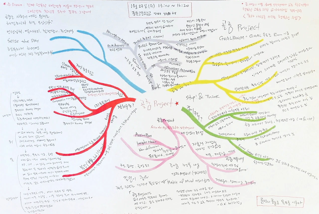 한 시간 반이나 골룸 프로젝트에 대해 쉴 틈 없이 대화를 나눈 후 선생님은 놀라운 제안을 하셨다. 바로 다음 날, 그러니까 내일, 교사 연수를 세 시간 진행하는데 15분 정도 골룸 프로젝트로 사례 발표를 해보는 게 어떻겠냐고 하셨다. 부담스러워서 못 할 것 같다고 하니 “지금처럼 편하게 얘기하면 돼”라고 하셔서 결국 해보기로 했다. 바로 다음 날이었기 때문에 쌤과 헤어진 후 집에 들러 노트북을 챙겨 24시 카페에 자리를 잡았다. 반나절은 골룸 프로젝트의 탄생과 일년의 과정을 정리하는 마인드맵 작업으로 반나절은 처음 해보는 피피티 작업으로 밤새 발표 준비를 마무리하고 학교로 향했다.