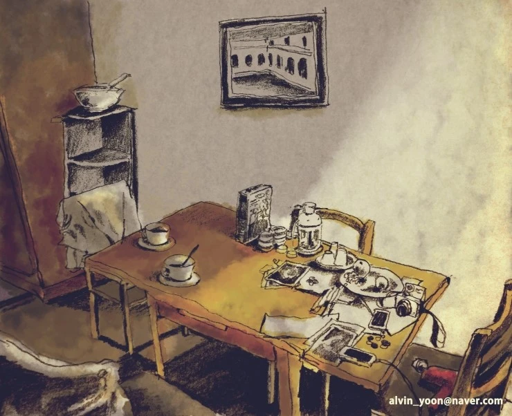 필름 카메라를 들고 집안 여기저기를 찍다, 엽서를 쓰다 일어난 테이블을 보니 분위기가 좋았다. 늦은 밤이었지만, 그림에선 빛을 햇빛으로 담고 싶었다.