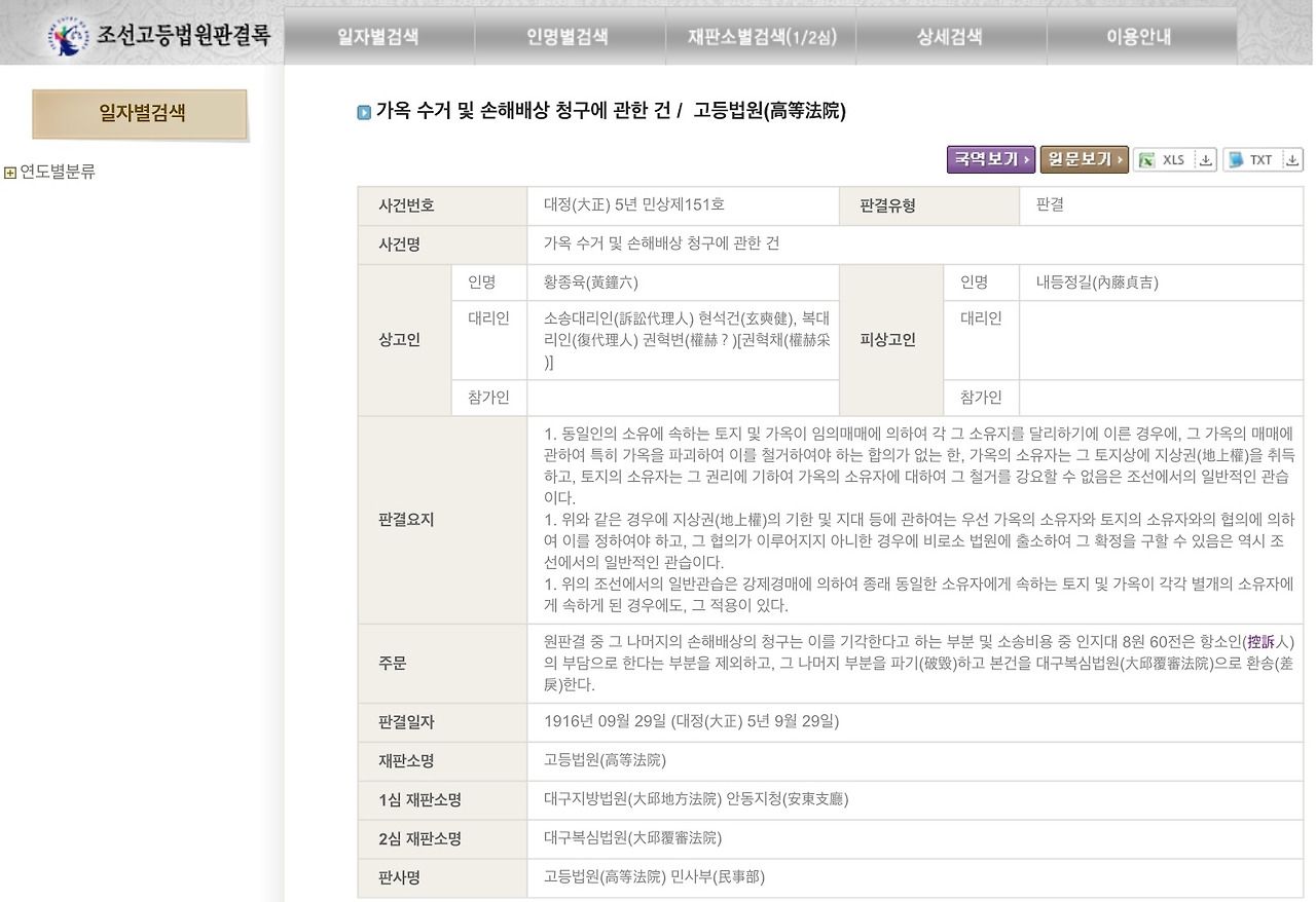 그리고 어느 일본인(내등정길)이 취득한 토지에 거주하는 조선인(황종육)에게 건물을 비우고 나가라는 소송에서