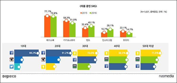 2016년 조사에 의하면 한국에서 쓰는 4대 SNS는 페이스북, 카카오스토리, 밴드, 그리고 인스타그램으로 나타났다.