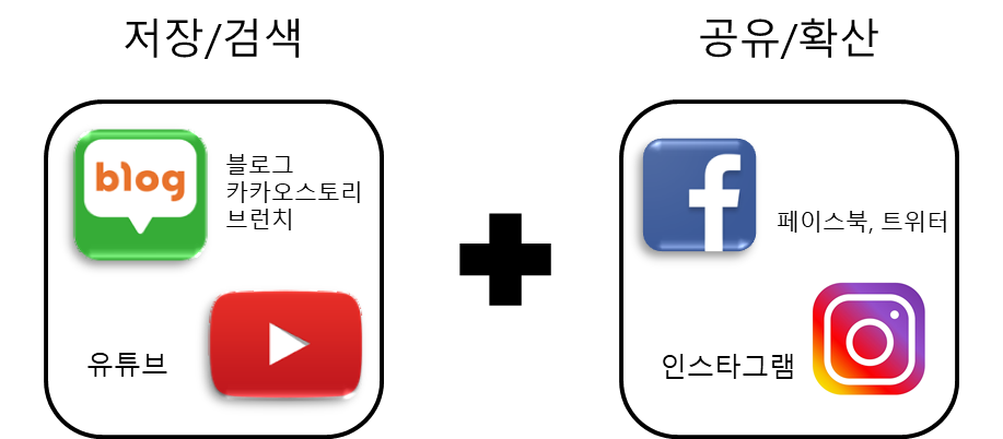위의 그림은 '저장/검색'하여 '공유/확산'하는 SNS 채널 간의 관계를 나타낸 것이다. 왼쪽의 그림처럼 전시회 홍보를 위한 보도자료, 언론 인터뷰, 동영상 등의 콘텐츠는 기업 블로그나 유튜브 등의 저장 채널을 통해 기록되고 보관되어야 한다. 이러한 저장 채널은 언제건 사용자가 검색이 가능하기 때문에 온라인상에 영원히 존재하고 원하는 때에 보여진다. 전시마케팅에서 언론활동의 제일 중요한 점은 네이버나 구글 검색에 뜨는 것이라고 했는데, 바로 이런 블로그나 유튜브와 같은 저장 채널에 콘텐츠가 담겨 있어야 가능하다.