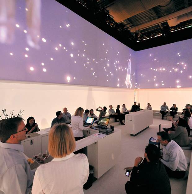 아래의 사진은 콘셉트를 '소음 속의 고요'로 잡은 한 기업의 부스 디자인이다. 매 20분마다 사각의 패브릭 천이 천정에서 내려와 부스의 4면을 감싼다. 그리고 4면에 비주얼 이펙트 및 사운드로 기업의 브랜드 이미지를 전달한다. 그 순간 전시장의 외부 소음은 들리지 않고 오직 명상 음악과 신비로운 비주얼 이펙트가 온몸을 감싸게 된다. 브랜드는 전시장에서 제품을 팔지 않는다. 고객들과 브랜드가 하나가 되는 몰입의 순간을 전달한다.