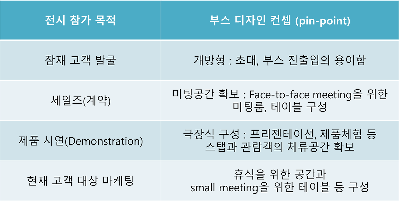 어떤 형태의 부스를 계획하건 제일 먼저 고려해야 할 것은 전시회를 왜 나가는지에 대한 명확한 목표 설정이다. 목표가 설정되면 그에 따른 부스 크기나 형태는 자연스럽게 결정된다. 아래 표를 보자.
