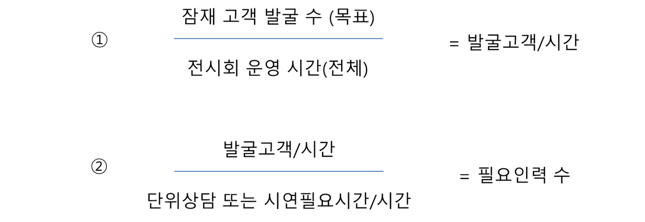 적정 인력 산출은 부스의 크기나 현장 마케팅 방법을 결정하기 위해 필요하다. 이론적이긴 하지만 아래의 산출 공식을 기본으로 대입하여, 현재 우리 회사의 상황에 맞게 인력을 산출하면 보다 효율적으로 부스 인력과 부스 크기 등을 결정할 수 있을 것이다.