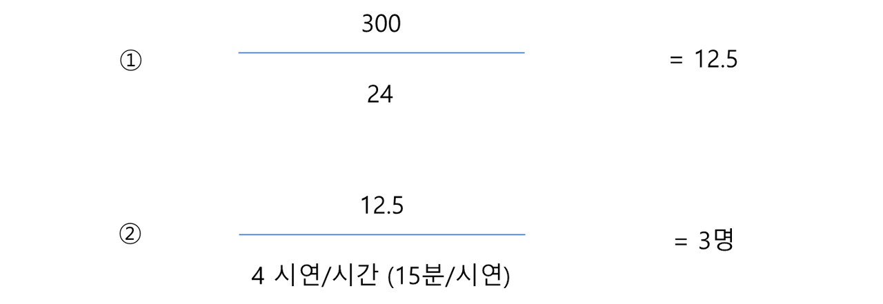 ②는 ①의 발굴 고객/시간을 분자로 하고 분모에는 데모나 상담에 필요한 시간을 적는다. 만약 데모가 평균 1회에 15분이 걸린다면 한 시간 기준으로 4번 한다는 뜻이다. 이렇게 분자를 분모로 나누면 최종적인 필요 인력 숫자가 도출된다.