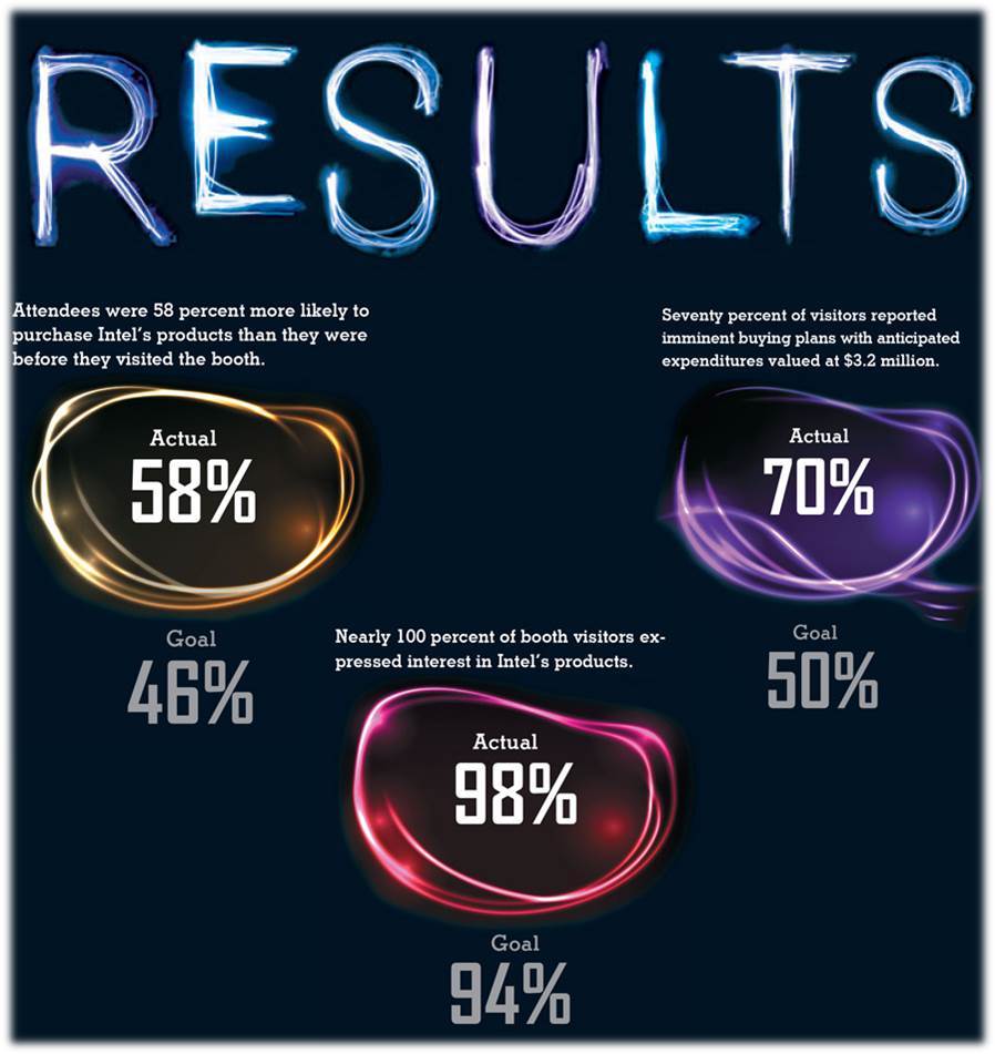 인텔은 CES 등의 IT 관련 전시회에 꾸준히 참가하여 성과를 측정한다. 아래 그림은 인텔의 전시 참가에 따른 자체 평가 결과를 보여준다. 왼쪽의 그림은 인텔 부스 방문 후 구매 의사를 밝힌 방문객을 조사한 결과이다. 가운데 아래는 인텔 제품에 관심을 표현한 방문객을 조사한 수치이다. 그리고 오른쪽은 부스 방문 후 즉각적인 구매 의사를 밝힌 관람객을 조사한 수치이다. 물론 자체 조사이기 때문에 객관성을 확인할 수는 없으나, 단순히 계약액이나 상담액과 같은 조사방법이 아니라 구매의사, 관심도, 구매액 등의 다양한 관점으로 전시회의 성과를 측정하고 발표한다는 점에서 참고할 만하다.