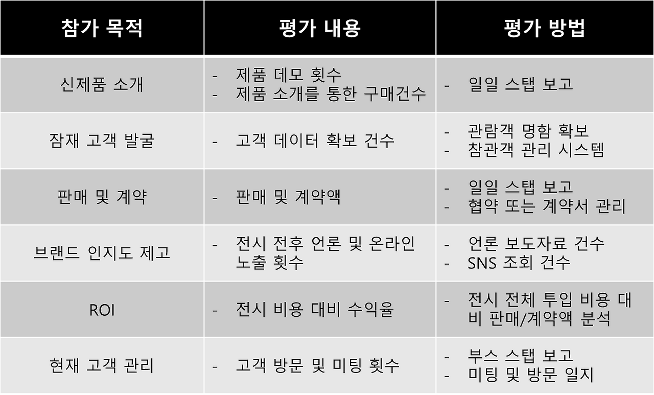 전시회의 참가 목적은 기업마다 다 다르기 때문에, 참가 목적에 따른 평가 방법 역시 달라져야 한다. 아래의 몇 가지 목적에 따른 평가 내용을 참고하여 전시회의 성과를 분석하는 방법을 알아보자.
