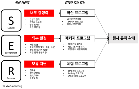 즉 마이스 도시의 경쟁력을 S, E, R로 분석하고 각각의 경쟁력을 확산, 패키지, 체험 프로그램으로 연결하게 되면 마이스 방문자의 만족도를 높여 행사의 자연스러운 유치 확대를 가져오게 되는 것이다.