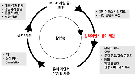 그럼 과연 위의 문제들을 해결하기 위해선 무엇을 해야 하는가? 일종의 개방형 마이스 사업 참여 시스템이 필요하다. 대표적 국제 컨벤션 기구인 ICCA는 전 세계 도시로부터 마이스 행사 유치 제안을 받기 위한 시스템이 있다. 먼저 마이스 행사 유치 관련 RFP(Request For Proposal: 제안요청서)를 띄우면 전 세계 도시들이 해당 RFP를 분석하고 제안서를 작성하여 제출한다. 이후 관련 단체 전문가들이 PT 및 지역 답사를 통해 실사하고 최종 개최 도시를 결정한다. 이것이 대부분의 국제회의 유치 결정 과정이다. 이 프로세스를 이해하면 도시들도 마이스 얼라이언스가 스스로 참여할 수 있는 시스템을 만들 수 있다. 즉 도시가 마이스 행사를 유치하기 위한 RFP를 지역 얼라이언스 사업자들에게 공유하고, 얼라이언스별로 특화된 서비스를 통해 해당 사업 참여의사를 밝히면 지역 관광재단이나 CVB가 최종 제안서를 작성하여 제출하는 것이다. 이후 현장 실사와 PT 과정에서도 지역 얼라이언스만의 서비스를 체험할 수 있음을 부각한다면 그 도시는 타 제안 도시와의 경쟁에서 우위를 점할 수 있다.