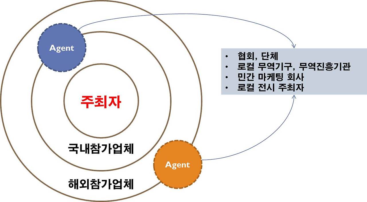 부스 영업은 주최자가 직접 다 할 수도 있지만 보통의 경우 부스 영업을 위한 에이전트를 별도로 둔다. 에이전트는 보통 관련 협회나 재단 등을 활용하며, 민간 에이전트를 두기도 하는데, 에이전트는 현지 업계에 밝은 전시주최자나 민간 홍보대행사 또는 개인의 네트워크를 활용한 전문가 집단을 쓰기도 한다.