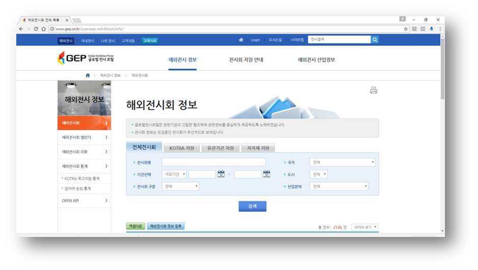 GEP는 코트라가 운영하는 전시회 전문 포털사이트이다. 이 사이트의 특징은 해외전시회중 단체나 개별 참가 지원이 가능한 전시회를 따로 분류해 놓았다는 점이다. 중소기업들이 보통 해외 전시회 참가시 예산 지원을 많이 필요로 하기 때문에, 이 사이트를 활용하면 여러 전시회 중 지원 가능한 정보를 일목요연하게 검색할 수 있다.