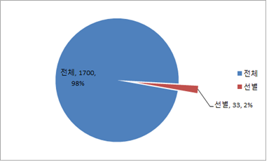 그 결과 전체 1,700개의 전시회중 33개 전시회가 도출되었고, 비율로는 약 2%에 해당된다. 품목별로는 건축/패션/문화/미화, 환경/교통,항공 등의 순으로 신규 전시 대상에 포함된 것을 볼 수 있다.