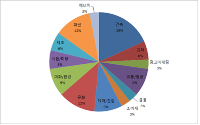 위에서 도출된 33개의 전시회를 산업 분야별로 살펴보면, 아래 그림처럼 건축분야가 6개로 전체의 19%를 차지한다.