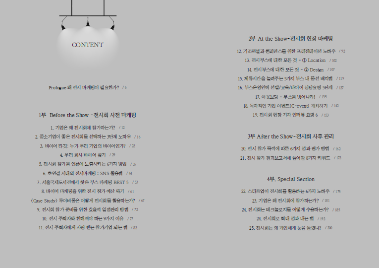 이형주 대표는 “이 책은 전체적으로 부스를 벗어나 전시회 전체 판을 활용하는 아웃 보딩의 방법들을 담고 있다”며 “전시회는 전시, 콘퍼런스, 미팅, 관광, 축제가 어우러진 종합 마케팅 플랫폼이다. 전시 3일의 콘텐츠로 일 년 365일의 콘텐츠로 활용할 수 있는 전시 노하우를 알고 있다면 중소기업이 한정된 예산으로 최대의 전시 참가 성과를 거두게 될 것”이라고 말했다.
