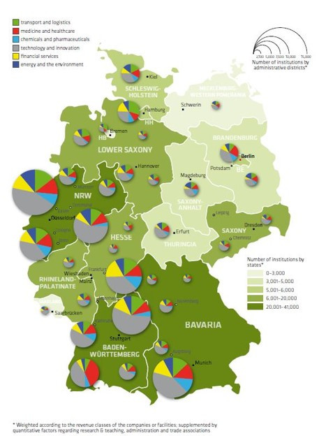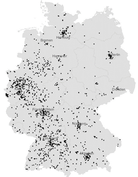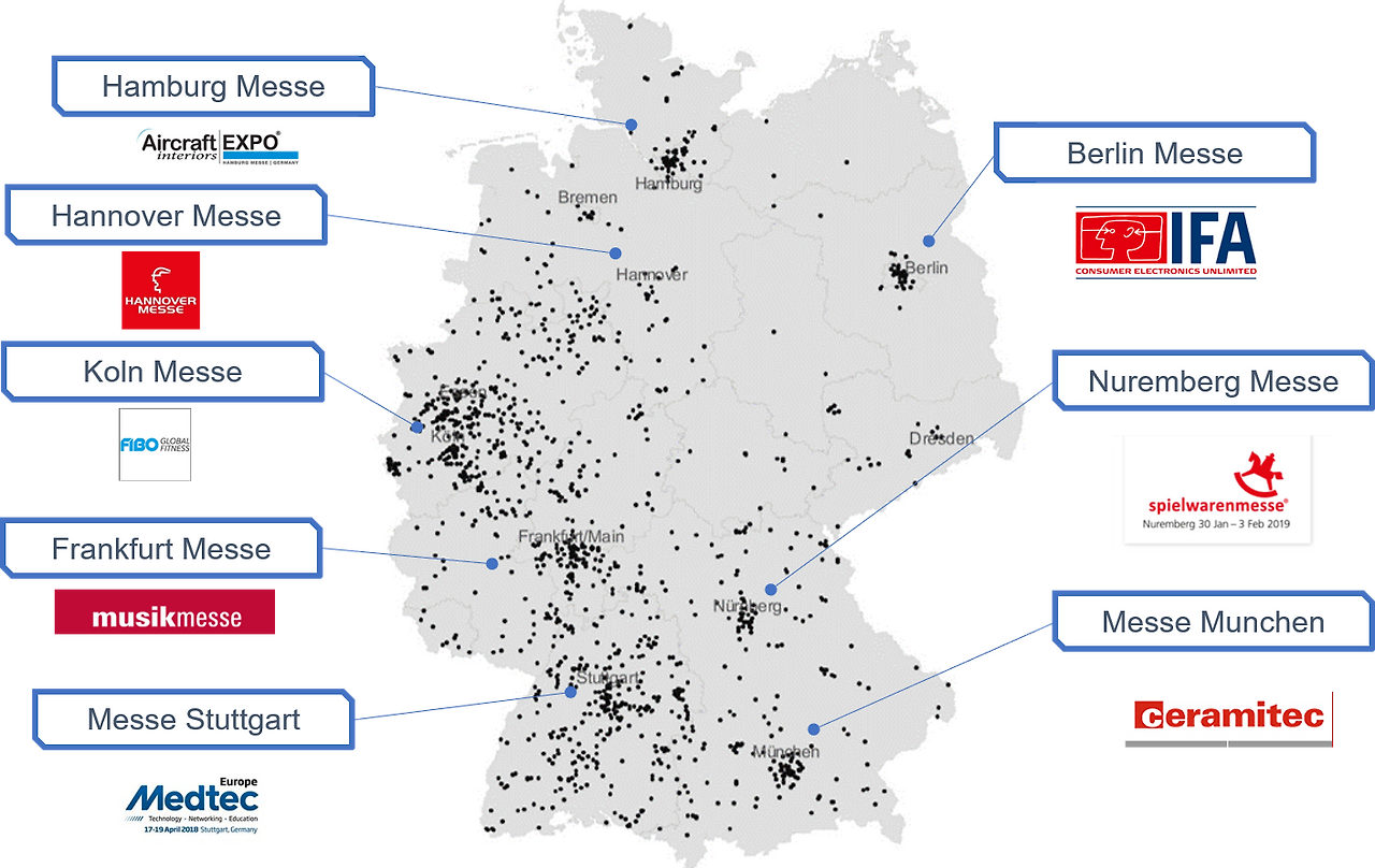 이러한 간단한 논리로 본다면 독일 전시산업의 성공은 어찌 보면 당연한 결과다. 세계적으로 기술력이 뛰어난 중견중소기업들이 많고, 또 대부분 세계 최고의 기술과 제품을 보유하다 보니 전 세계에서 이런 '미텔슈탄트'와 거래를 하지 않을 수 없다. 다양한 미텔슈탄트를 한자리에서 만날 수 있는 방법은 결국 전시회밖에 없는 것이다. 아래 그림은 독일의 지역별 히든챔피언 분포도를 표시한 것이다. 히든 챔피언이 분포된 지역을 점으로 표시했다.