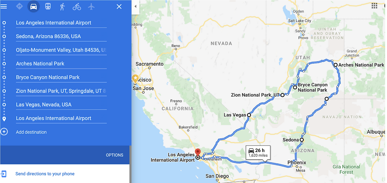 이 동선이 쉬지않고 차로 달려도 26시간이나 걸리는 무시무시한 여정이기 때문에 여행 전에 어떠한 운전 스케쥴로, 어떠한 방문 스케쥴로 여행을 계획해야할지 고심하지 않으면 운전자나 동승자나 무지 피곤해지는 시간이 된다. 앞서도 언급한 바와 같이 나의 경우는 만 4세 아들까지 함께였기 때문에 출발 전에 아들이 이 힘든 여행을 함께할 수 있을지의 여부였다. 하지만 결론부터 말하면, '잘세운 계획, 불가능은 없다'는 것이다. 무엇보다 이번 여행에서 가장 중점적으로 고려한 부분은 연속 운전시간의 관리였다. 이 여행을 가기 전 별도의 여행에서 그랜드캐년을 운전시간 관리없이 다녀왔던 경험이 약이 되었으리라. 그때는 무식하게 운전만 10시간씩 해버렸고 여행 이후 몇 일간의 요양시간(?)을 가질 수 밖에 없었기 때문이다. 그래서 하루 최대 운전 시간은 4시간으로 관리하고자 했다. 그것을 염두해두고나니 동선짜기가 수월해졌고, 운전 시작 전 맘 속의 부담이 한결 가벼워졌다. 그렇게 나온 나의 동선, 중간의 경유지는 아래와 같다.