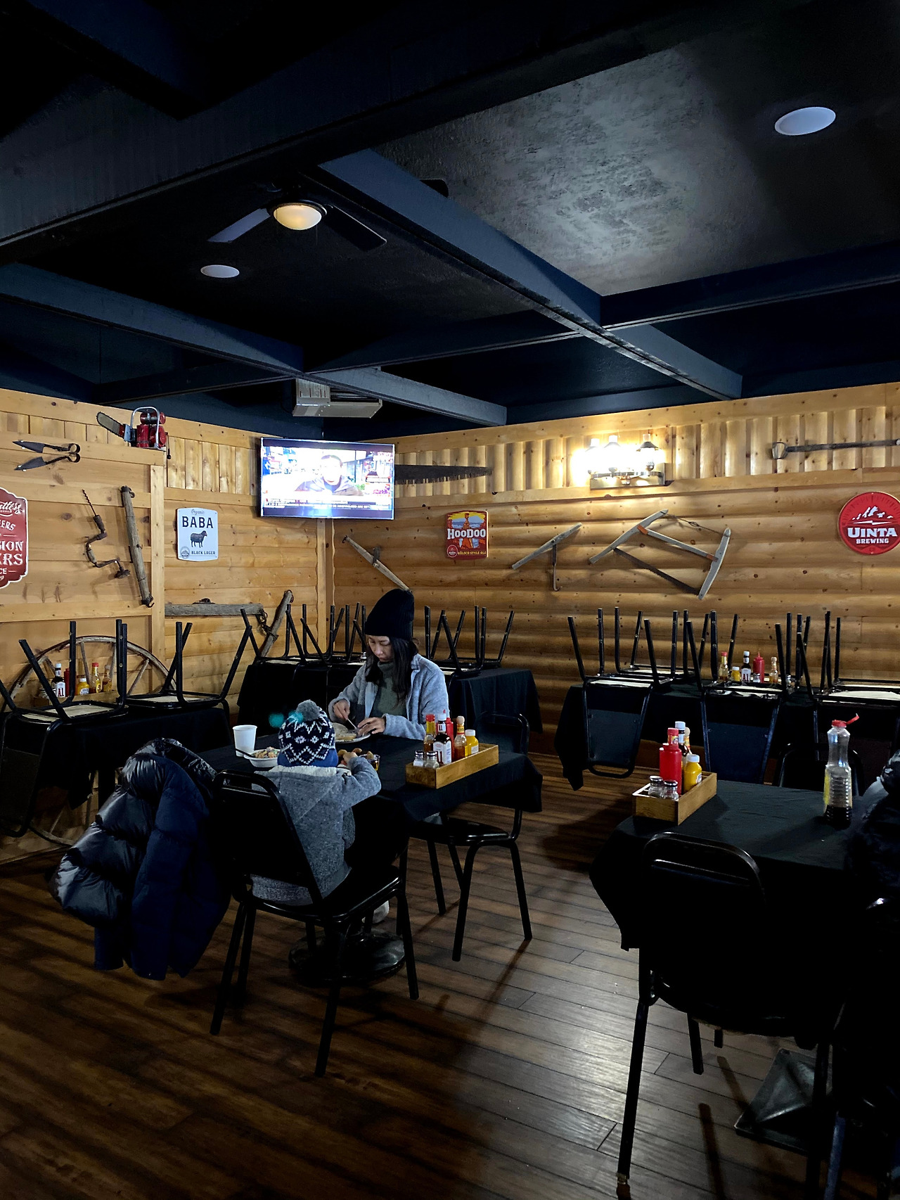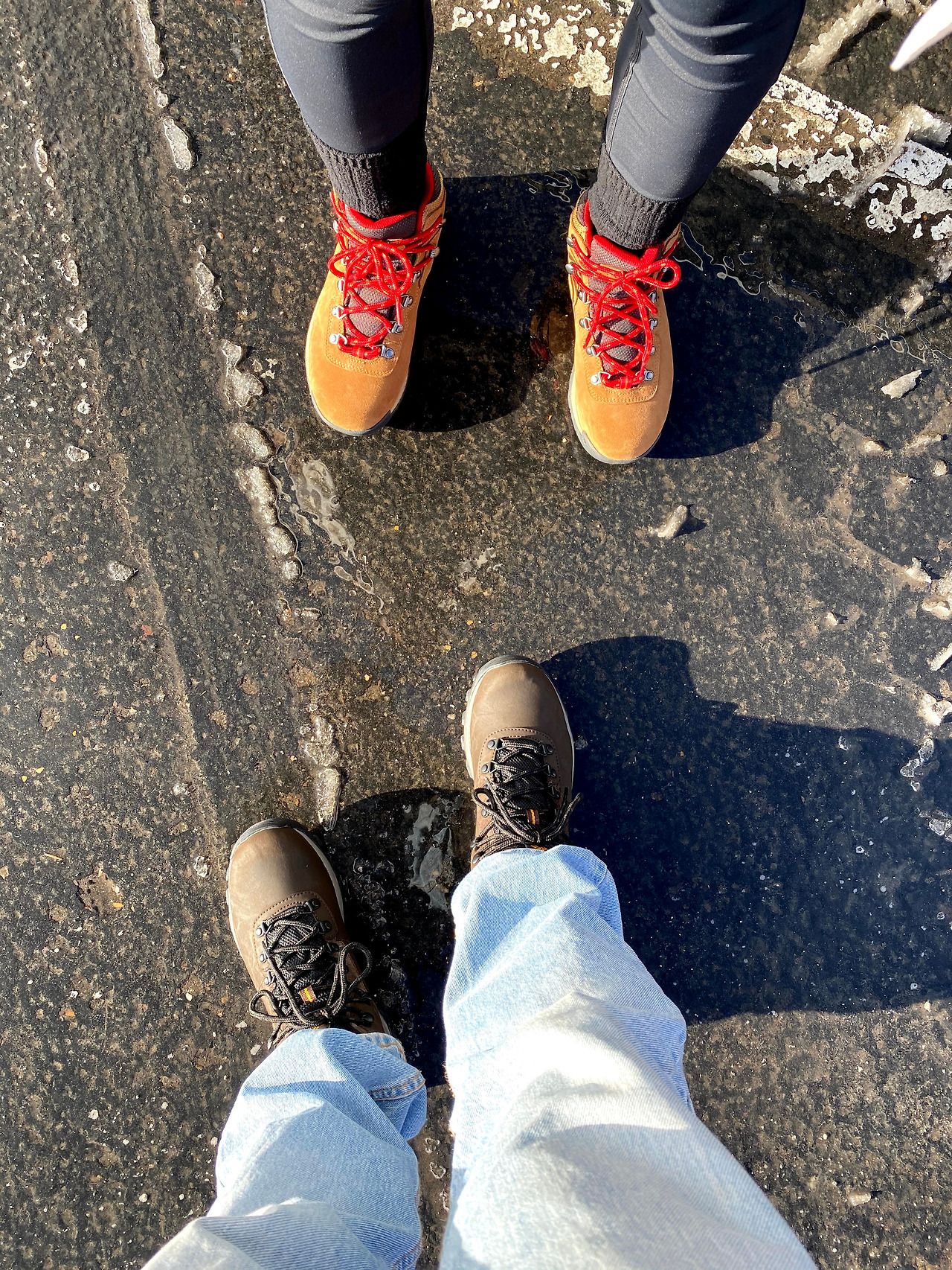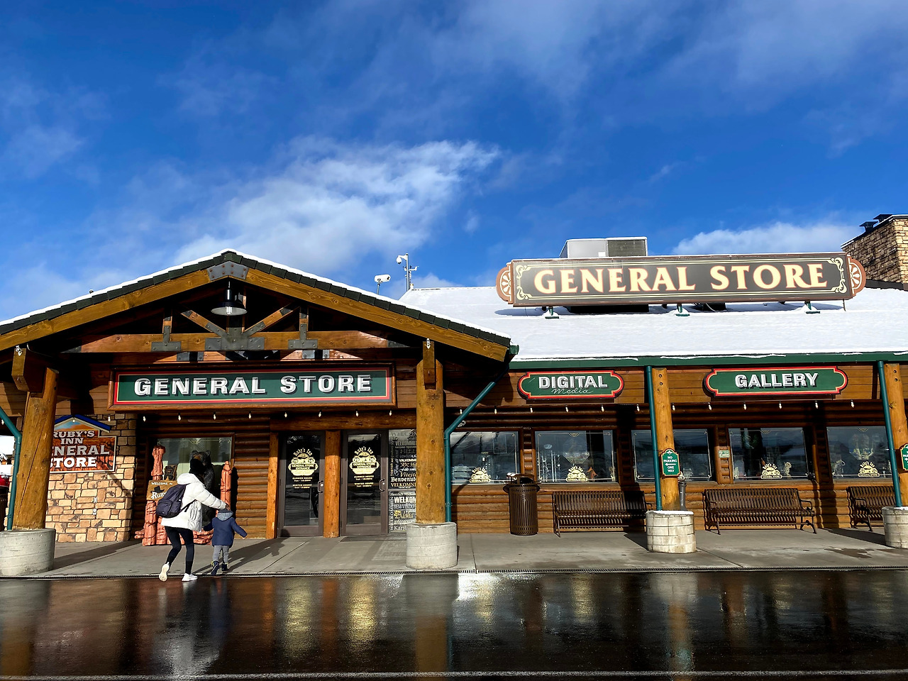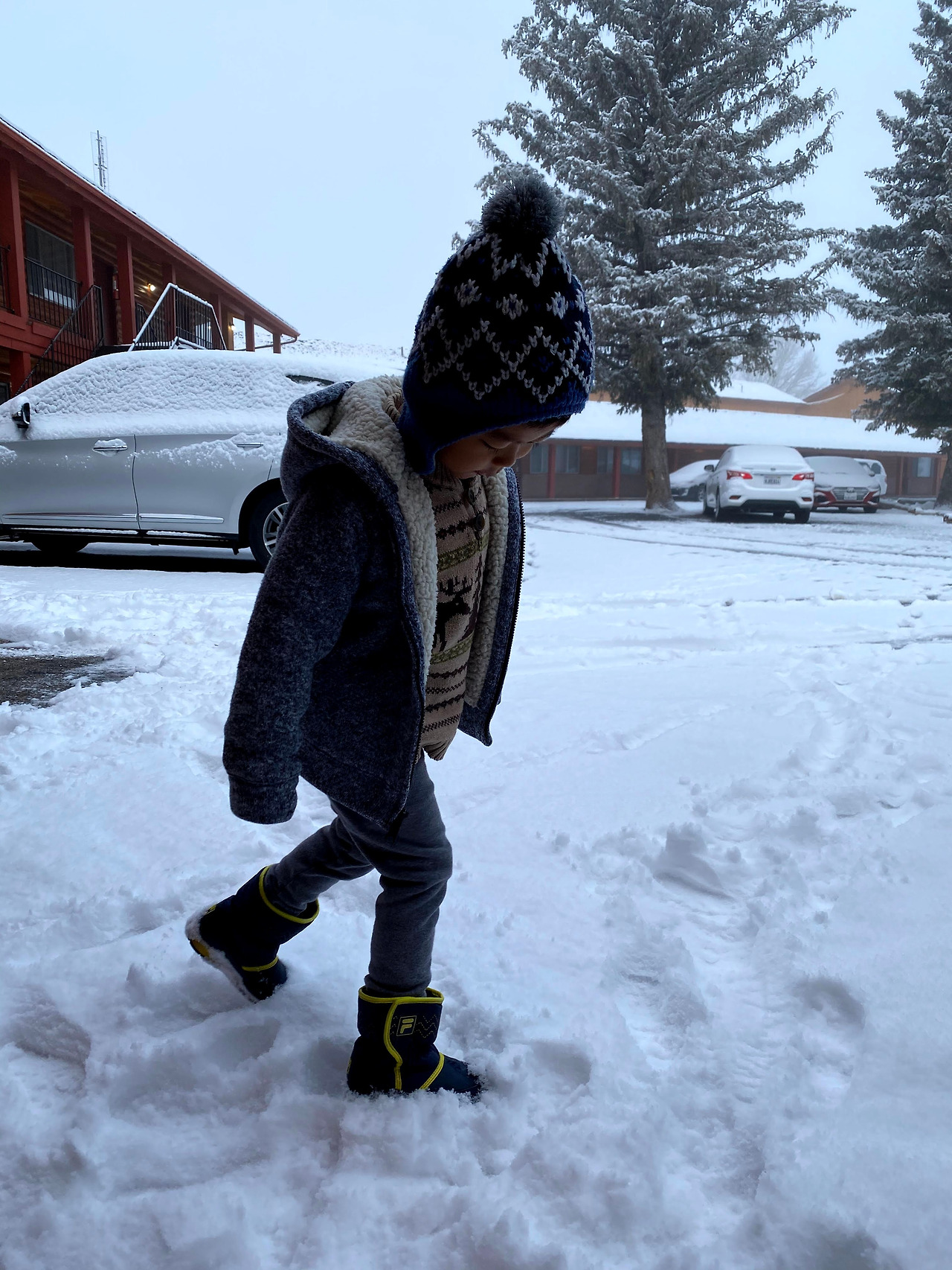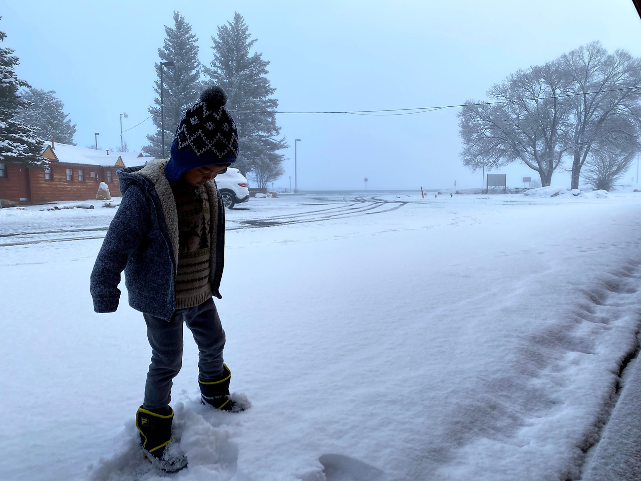 2020년을 이야기할 때 빼놓고 설명할 수 없는 사회현상이 되어버린 코로나바이러스. 한국에선 진작에 큰 뉴스가 되고 사회적으로도 많은 조치를 취하고 있었으나 3월 둘째 주 정도가 되서야 미국은 그 심각성을 대중들과 공유하기 시작했다. 조식식당에서 만났던 모습을 시작으로 다음 코스인 자이언캐년 Zion Canyon도 주요코스 폐쇄 및 롯지 사용중지를 간밤에 메일로 안내해왔다. 다행히 우리는 여기서 2박을 할 수 있었기에 급한 불은 껐지만 나의 삶이 크게 변하게 될 것이라고 아직까지 실감하지 못했기 때문에 아직은 여행에 집중하기로 한다. 천진난만한 아들은 눈이 좋았던 모양이다. 어렸을 때 한국에서 눈을 보기는 했으나 캘리포니아에 살면서 눈을 본 적이 없었기에, 이제 스스로 인지할 수 있는 나이가 되어 본 눈은 이번이 처음이라 더 그랬나보다. 계획 수정을 해야하는 부모 둘에 비해 걱정은 없었으니 더 그랬으리라. 간밤에 눈은 생각보다 많이 와서 우리는 제대로 된 등산화를 살 필요가 있다고 생각했다. 다행히도 브라이스캐년 초입에 상점이 있어서 아이젠은 물론, 등산복, 간단한 간식거리도 모두 팔고 있다. 뜻하지 않게 커플 신발을 맞추고선 (올버즈 Allbirds 이후 첫 커플신발이다) 빙산도 탈 것 같은 기세로 사진 하나 같이 찍어보았다.