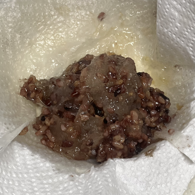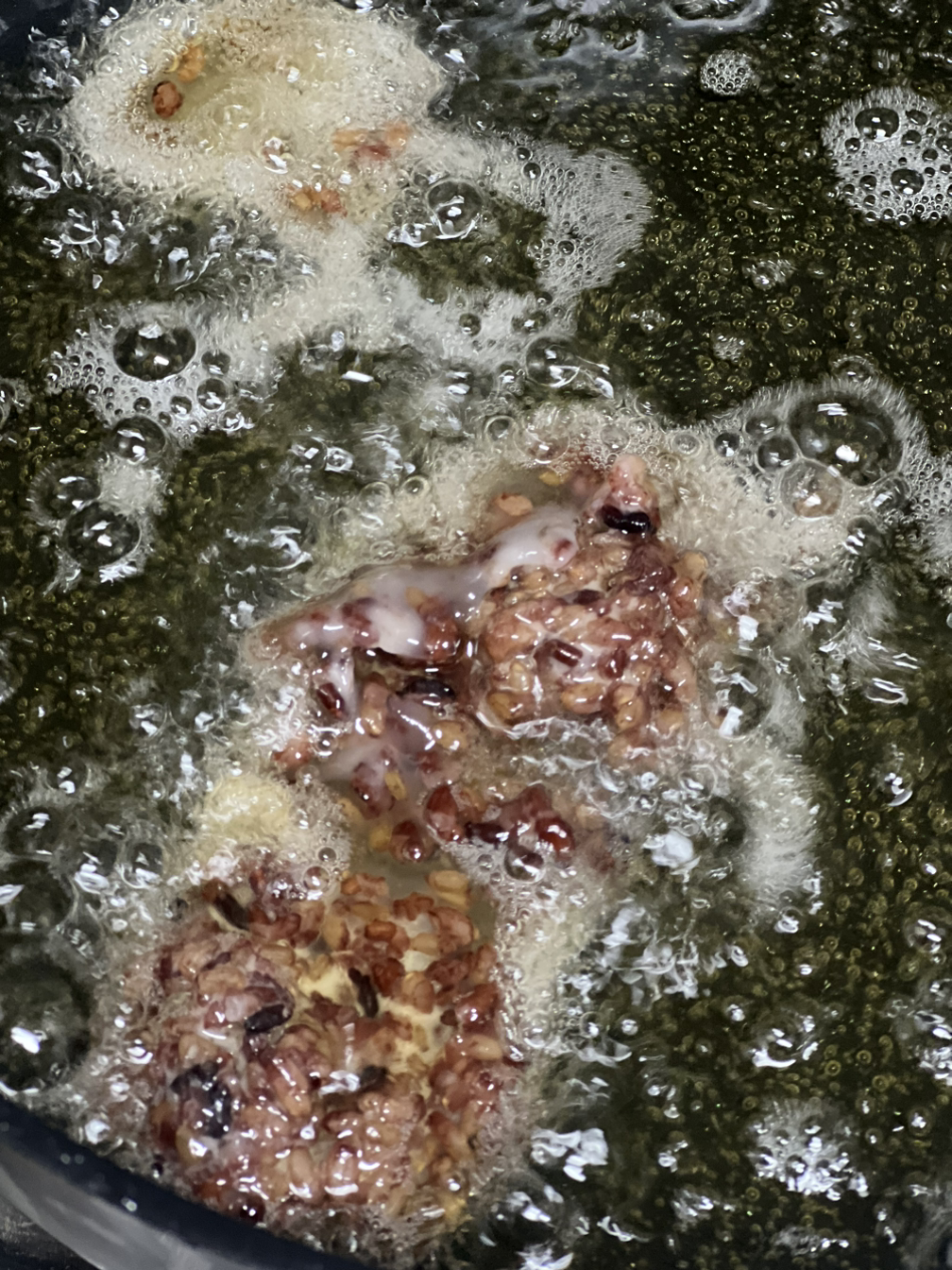 깐풍기를 다 먹고 뒷정리를 하려는데 소스가 세 숟가락 정도 남았다. 남은 소스를 버리기는 아까워 깐풍기를 더 만들어보고 싶었다. 그런데 갑자기 ‘야채 대신 밥을 튀겨보면 어떨까?’라는 호기심이 발동했다 즉시 밥통을 열어서 현미밥 세 숟가락을 떴다. 그다음 주먹밥에 김가루를 묻히듯이 현미밥에 전분을 입혔다. 가스레인지 불을 다시 켜고 기름을 빠르게 데운 뒤, 하얀 전분물을 묻힌 현미밥을 넣었다.