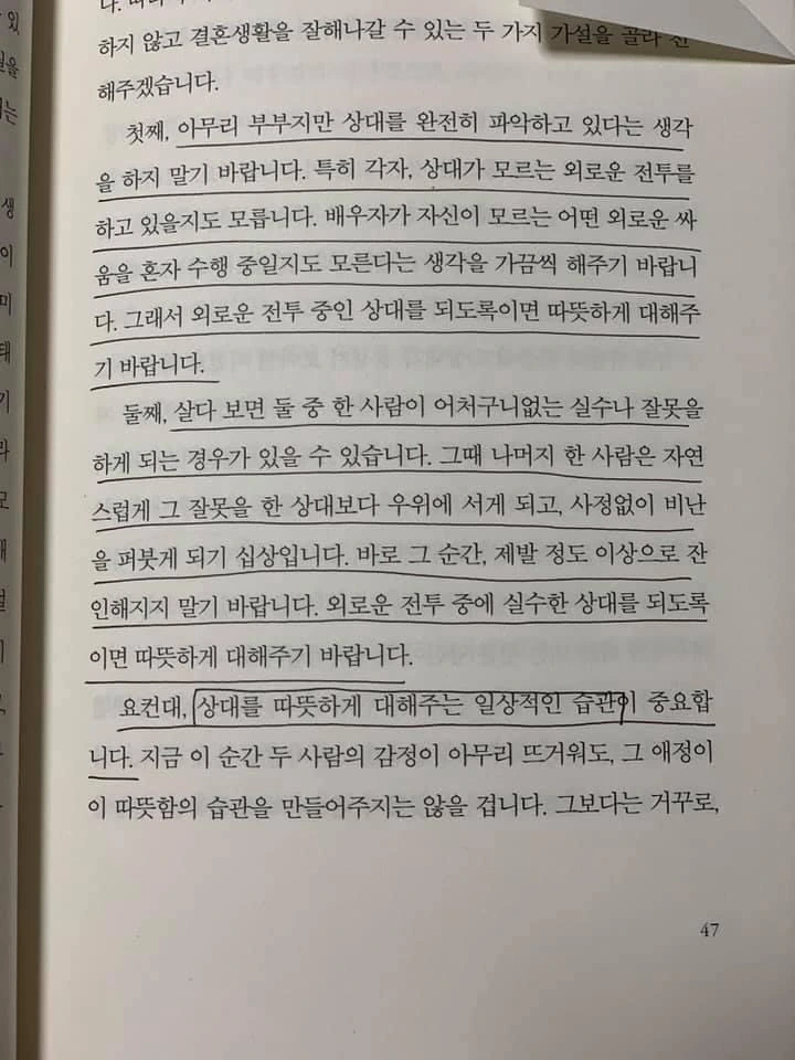 저자의 결혼식 축사가 참 좋았다. 결혼생활을 잘해나갈 수 있는 가설 두 가지, 그리고 '요컨대, 상대를 따뜻하게 대해주는 일상적인 습관이 중요합니다.'라는 부분은 많은 생각을 하게 했다. 그리고 이 책을 읽기라도 한 듯 '요컨대' 부분을 일상에서 실천하고 있는 남자친구에게 고마웠다.