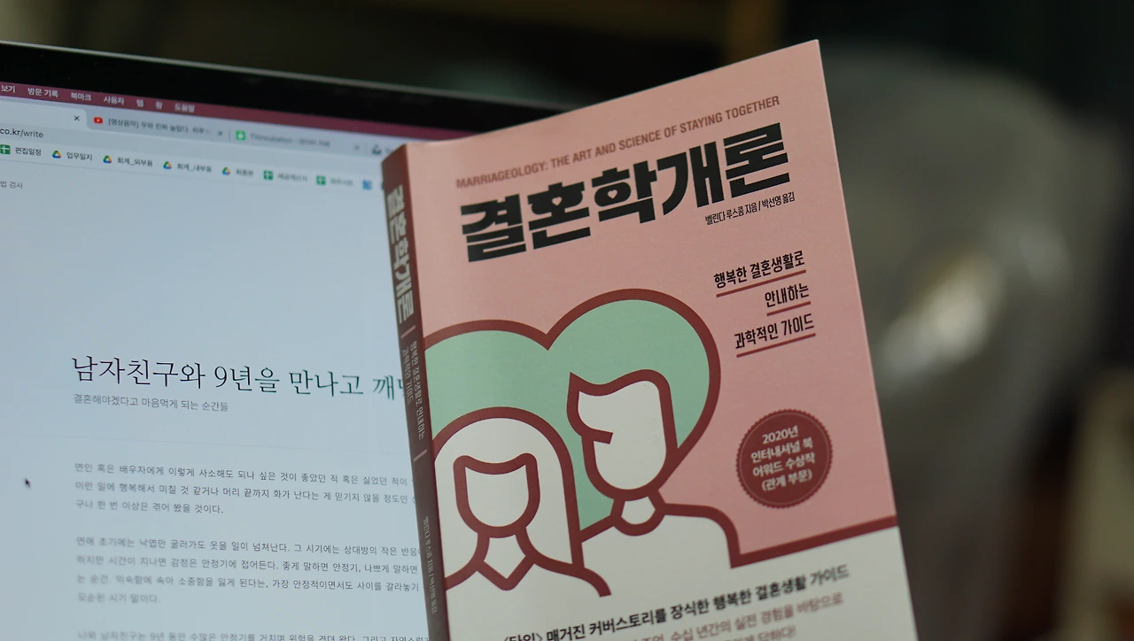 내가 남자친구와 결혼해야겠다고 마음먹은 순간들은 오백 번도 넘겠지만, 그중 책 <결혼학개론>에서 알게 된 내용과 내 결심이 일치하는 순간들을 이야기해 보려고 한다. 별것 아닌 일에 자주 싸우거나 혹은 지금보다 더 끈끈한 사이가 되고 싶은 커플이 있다면, 나의 사소한 9년 연애 이야기를 참고해 부디 도움이 되면 좋겠다.