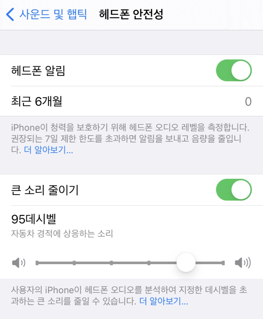 삼성폰이나 아이폰은 볼륨을 크게 키우면 이 정도의 볼륨이 어느 정도의 소리인가를 안내해 준다. 기본 기능이 안 되어 있다면 이번 기회에 설정해 놓으면 좋겠다.