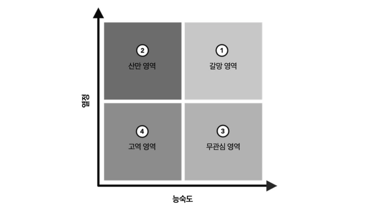 위 그래프를 주의 깊게 살펴 보자. 4영역인 '고역 영역'은 열정도 없고 능숙하지도 않은 업무로 구성된 영역이다. 기본적으로 하고 싶지도 않고, 잘하지도 않는 일들을 말한다. 맡은 업무 중 가장 최악이라고 할 수 있다. 3영역 '무관심 영역'은 능숙도는 갖췄지만 열정은 없는 업무들이다. 타성에 젖어 일을 하는 것도 3영역의 특징이다. 2영역인 '산만 영역'은 열정은 지니고 있으나 별로 능숙하게 해낼 수 없는 일들에 해당된다. 1영역 '갈망 영역'은 열정과 능숙도가 교차하는 지점으로 업무에서 가장 큰 공헌을 할 수도 있는 활동으로 구성된다.