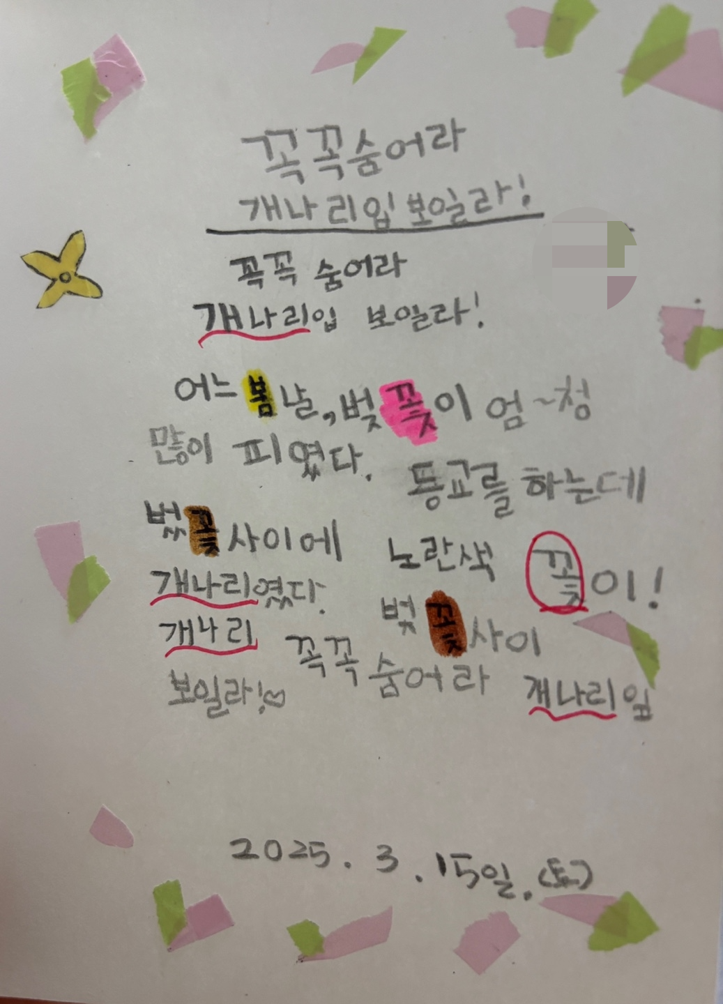 책장도 없는 작은 테이블에 집에서 쓰던 네모난 책꽂이 하나를 놓아 주었다. 그날 밤 아이는 책상에서 무언가 사부작사부작하더니 노트 한 권을 내밀었다. 다이어리 꾸미기를 하다가 시를 한 편 뚝딱 지어냈다.
