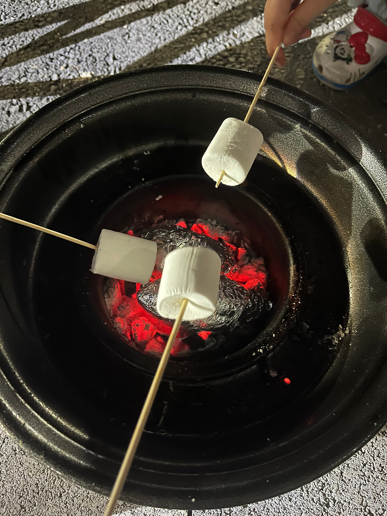 집에 돌아와 땀을 뻘뻘 흘리며 아이들 텐트를 쳐주고, 숯불을 피워 바비큐와 마시멜로까지 야무지게 구워 먹었다.