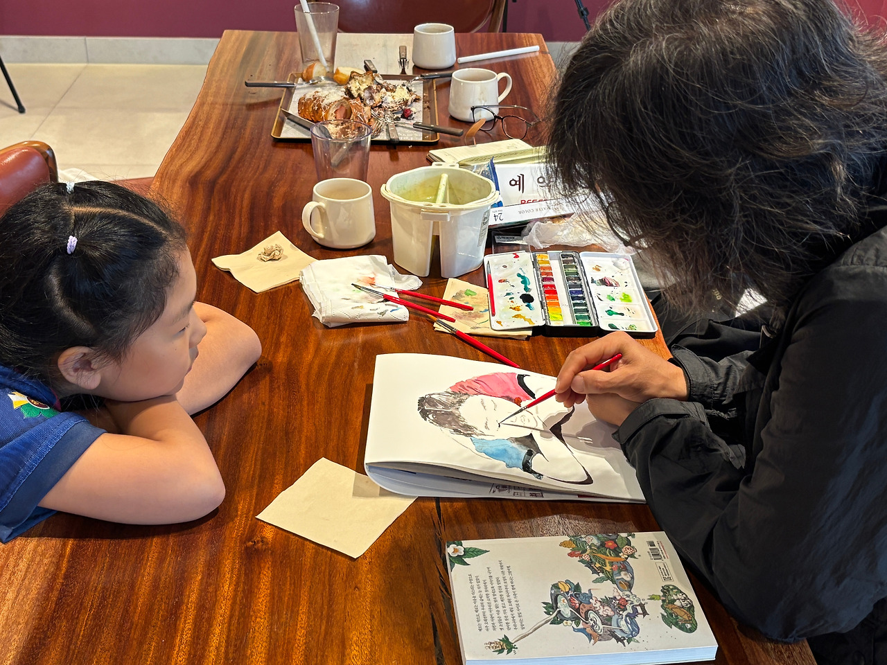 한 번은 아이와 전시를 보러 갔을 때, 작가님께서 테이블에 앉아 그림을 그리고 계셨다. 호기심 많은 아이가 이 좋은 구경을 놓칠 리가 없었다. 아예 작가님 맞은 편에 앉아 팔을 괴고 그림을 그리는 모습을 관찰하고 있었다.