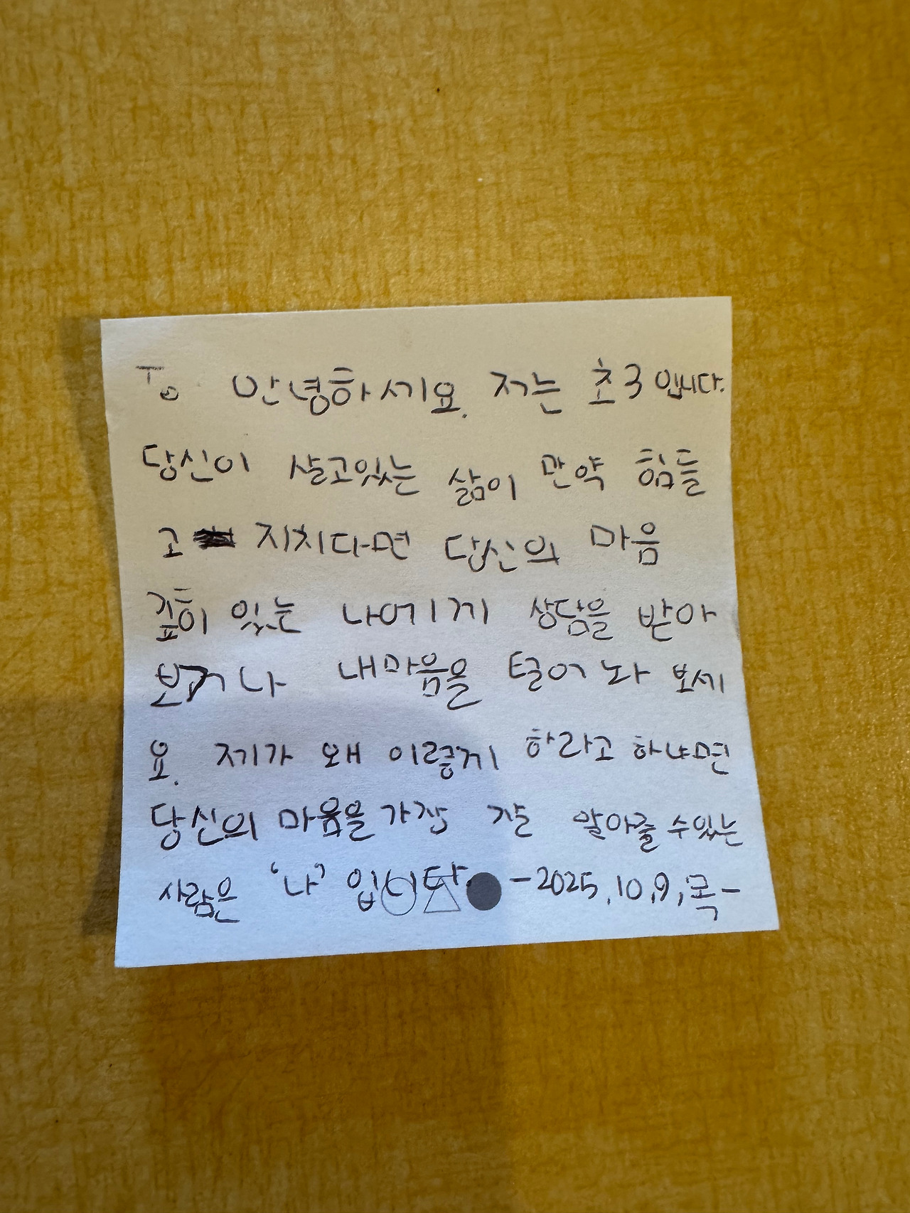 아이도 이곳을 다녀간 사람들이 남긴 쪽지를 보더니, 어느새 자리를 잡고 앉아 무언가를 끄적이기 시작했다.