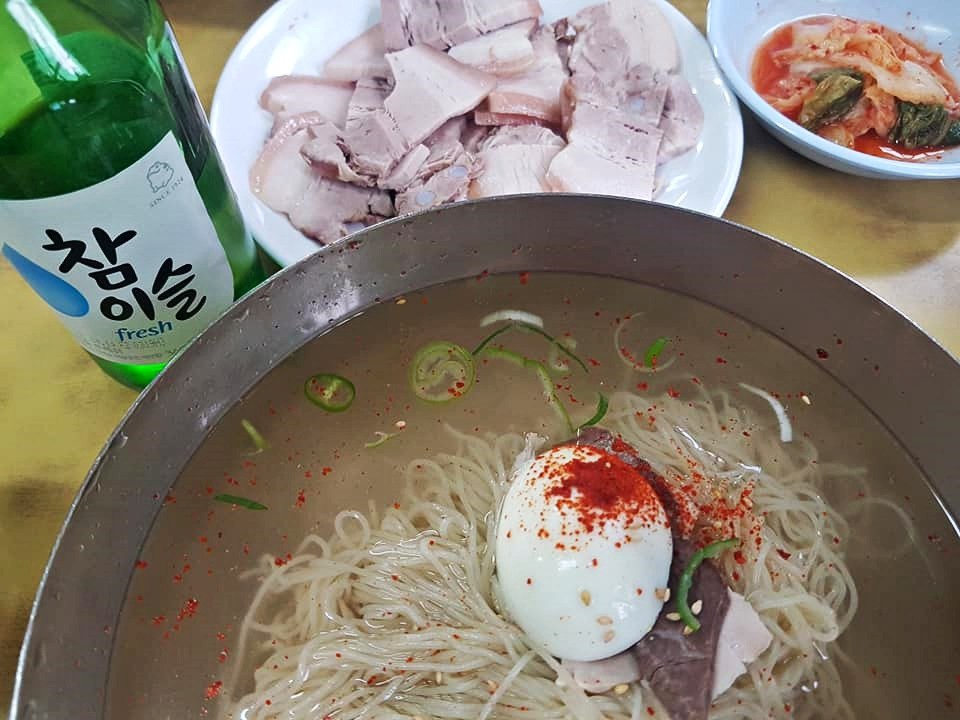 을지면옥의 대표메뉴인 평양물냉면과 제육.