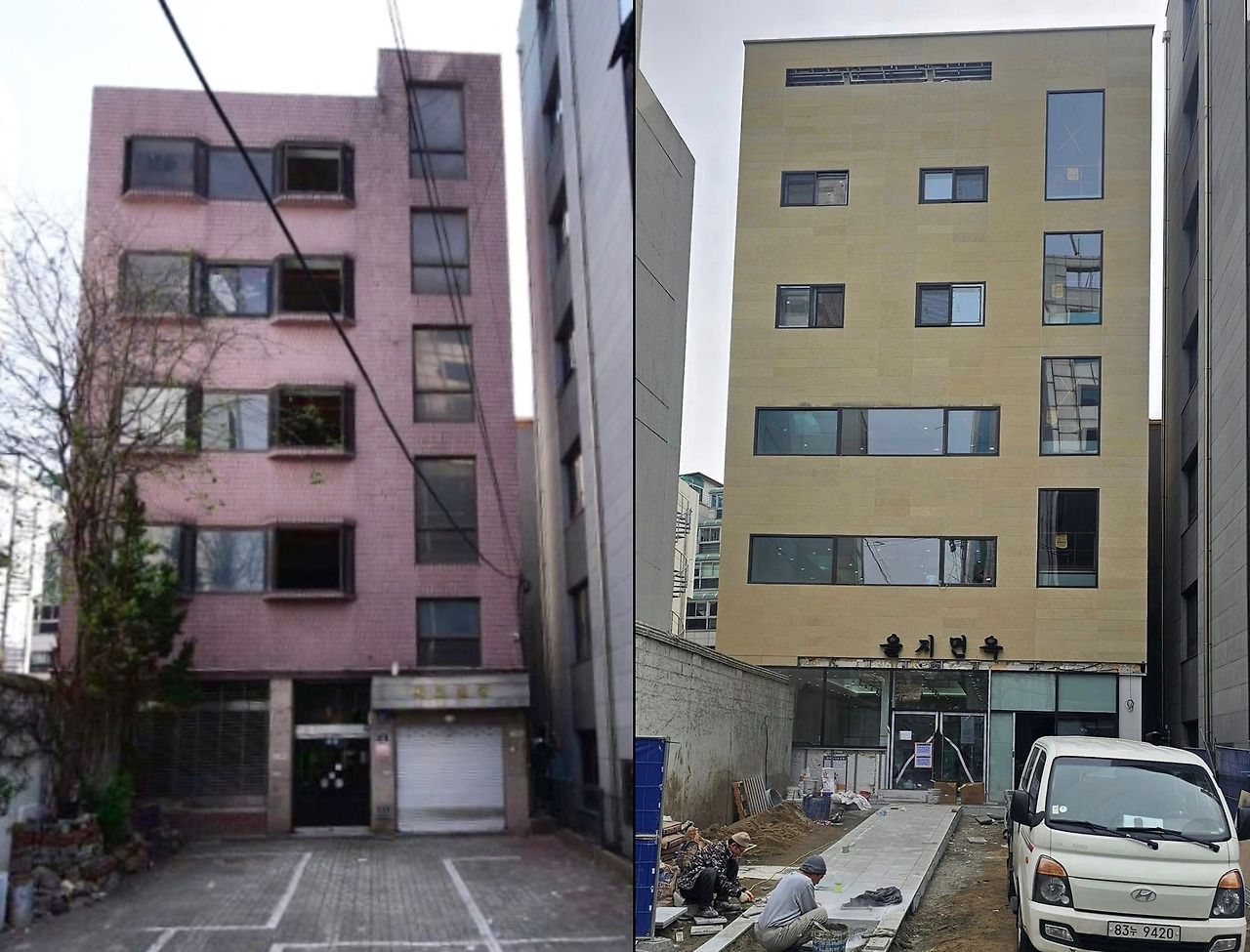 종로구 낙원동 55-1 옛 제일빌딩(사진 좌)을 리모델링 해 재개업을 준비 중인 을지면옥(하응백 제공). 옛 향수를 느낄 수 있도록 간판손글씨체 ‘을지면옥’을 따서 간판을 달았다.