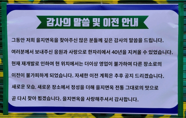 옛 을지면옥이 있던 자리는 세운재정비촉진사업에 따라 구도심이 사라지고 곳곳에 주상복합 아파트 등 마천루가 들어섰다. 일대가 재개발되면서 수많은 노포 맛집도 사라졌다. 을지면옥도 그중 하나였고 시행사와 마지막까지 보상금 문제로 긴 소송전을 벌였지만 양측 모두 웃지 못했다.