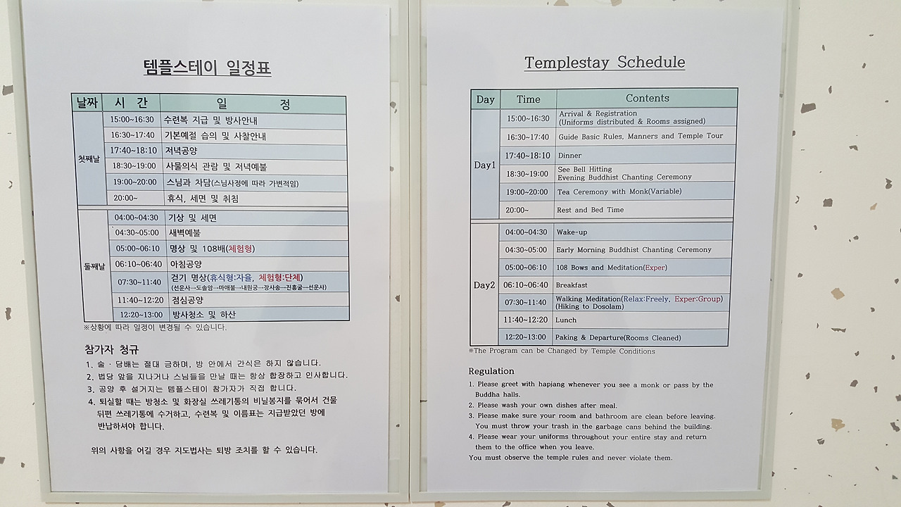 템플스테이는 보통 체험형, 휴식형, 수행형으로 나뉜다. 체험형은 발우공양, 연등만들기, 야생녹차만들기 등 다양한 프로그램이 계절 또는 사찰마다 조금씩 다르게 구성되어 있는데, 주로 주말에 진행되는 듯 하다. 수행형은 전체 일정 중 명상, 참선 등 수행이 차지하는 비중이 높은 프로그램이라고 한다. 나는 휴식형을 선택했다. 말 그대로 지친 몸과 마음을 달래기 위한 프로그램이다. 전체 일정 중에 부처님께 예를 올리는 예불과 공양, 사찰 안내 및 사찰 예절 교육 외 시간은 자유롭게 휴식을 취할 수 있다.