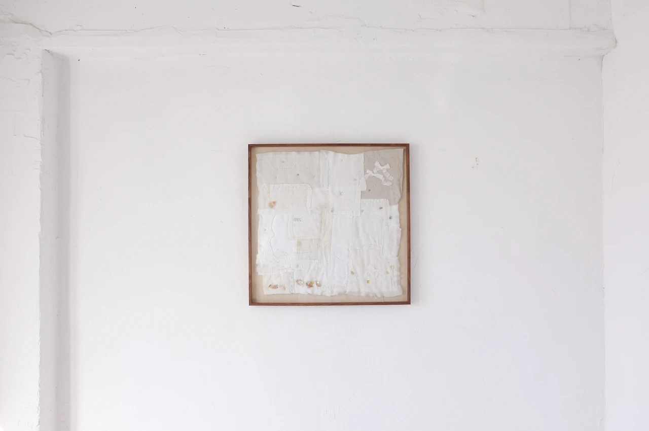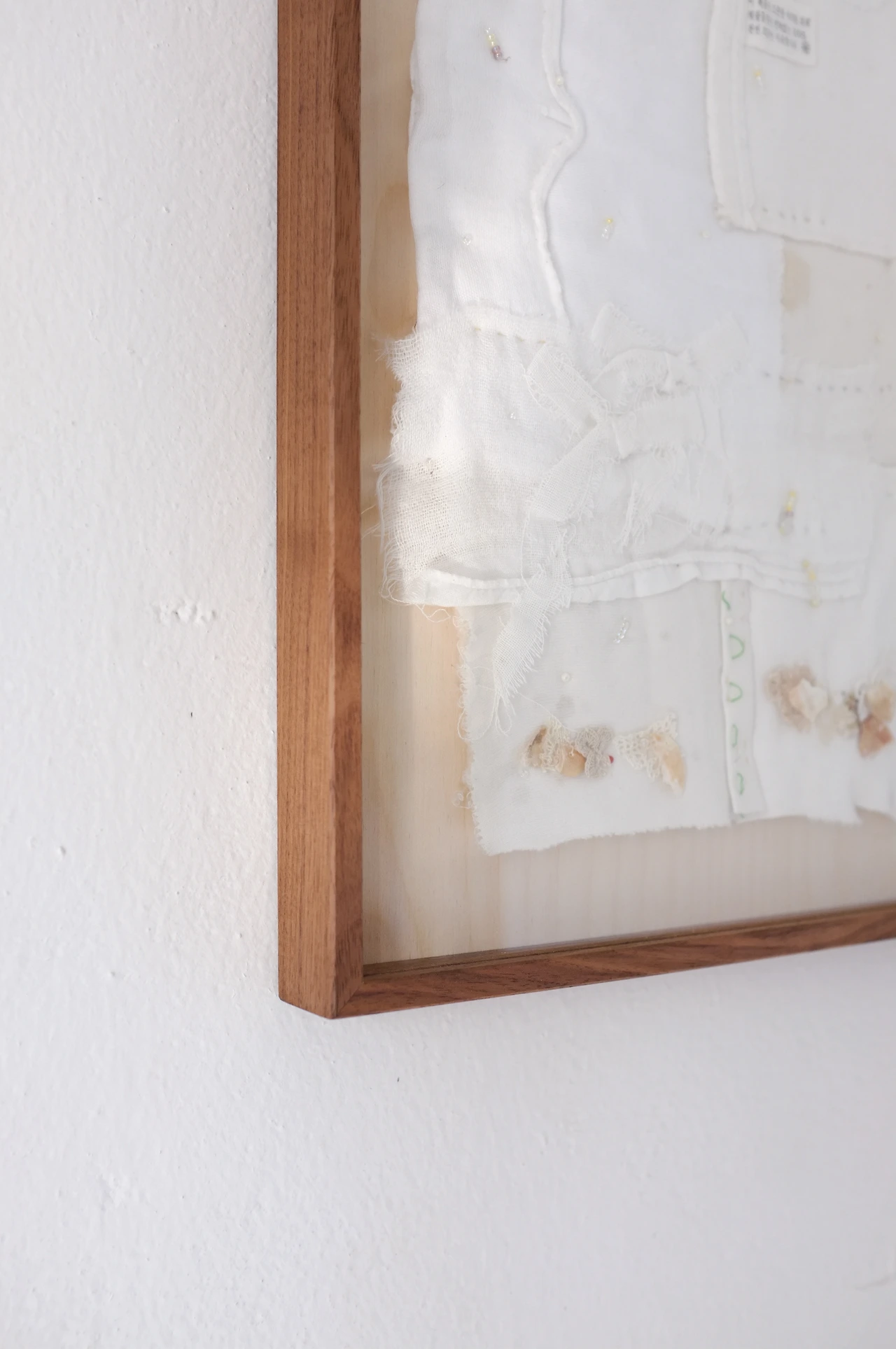 이건, 선미촌 여성들에 대해 소식을 듣고, 그녀들과 같이 함께 소외되고 고통받는 여성들을 생각하며 작업한 작품입니다. 나의 힘으로 어쩌지 못하는 삶의 무게와 현실의 어둠 속에서 살아도 생명력을 잃은 많은 이들의 삶이 개인적으로는 하나님을 알기 전의 후의 나의 삶 어딘가와 맞닿아 있다고 생각 했습니다. 그런 고통중의 사람들이 외부적으로도 그리고 내면적으로도 다시 태어난 듯한 삶을 갖길 소망했습니다. 그리고 그런 공의와 사랑이 없는 세상을 공의와 사랑으로 바꾸어 가는데 힘을 더하는 것이라고 생각해서 연대와 행동을 상징하는게 작품에 표현된 리본입니다. 여기 들어간 원단은 모두다 다시 태어남을 상징하기 위해 우리 아이들이 사용했던 베냇저고리, 천기저귀, 속싸개, 가잿수건 같은걸 사용했어요. 얼룩이 그대로 있는것도 택이 있는것도요. 우리 삶은 새로 태어나도 온전히 깨끗할 순 없지만 그런 아픔과 슬픔을 이겨내며 나아가는 것이라고 생각해서 원단을 있는그대로 살리기로 했거든요. 아래 조개는 그런 여성들이 빚어낸 아픔과 고유의 아름다움을 상징하고 있습니다. 조개는 진주를 빚어낼 수 있죠. 그리고 그 진주는 사실 조개의 입장에선 이물질이여서 자신을 지키기 위해 한 행동의 결과물 이고요. 우리가 우리 삶의 고통들을 마주하며 삶을 포기하지 않고 날 지키기 위한 마음과 행동을 할 때 결국 그 고통도 진주처럼 아름다운 무언가로 바뀌어 있을 수 있다는 의미를 담고 있습니다. 제게도 그런 시간이 있었기도 하고요. 그리고 작품 위 원석과 비즈들은 그녀들의 눈물, 그리고 그녀들과 함께 울어주는 우리와 성령님의 눈물을 의미해요. 원석은, 눈물을 흘리고 흘러 돌처럼 단단해져 버린 것이자 원석이 가진 아름다움을 조개와 비슷한 의미로 담고 있습니다. 여기서 리본은 총 5개인데요. 하나는 그녀들, 하나는 그녀들을 공감하고 지지하는 우리들, 그리고 하나는 하나님, 하나는 무언가의 계기, 남은 하나는 여정을 말하고 있습니다. 이 작품 속엔 유일한 붉은 비즈가 한 알 숨겨져 있는데요. 그것은 예수님이 살았고 죽어가면서 까지 추구한 삶의 가치를 말합니다. 결국 타자의 고통을 바라보고 그들과 손잡는건 성령의 가치관으로 살아갈 사람들이라고 생각합니다.