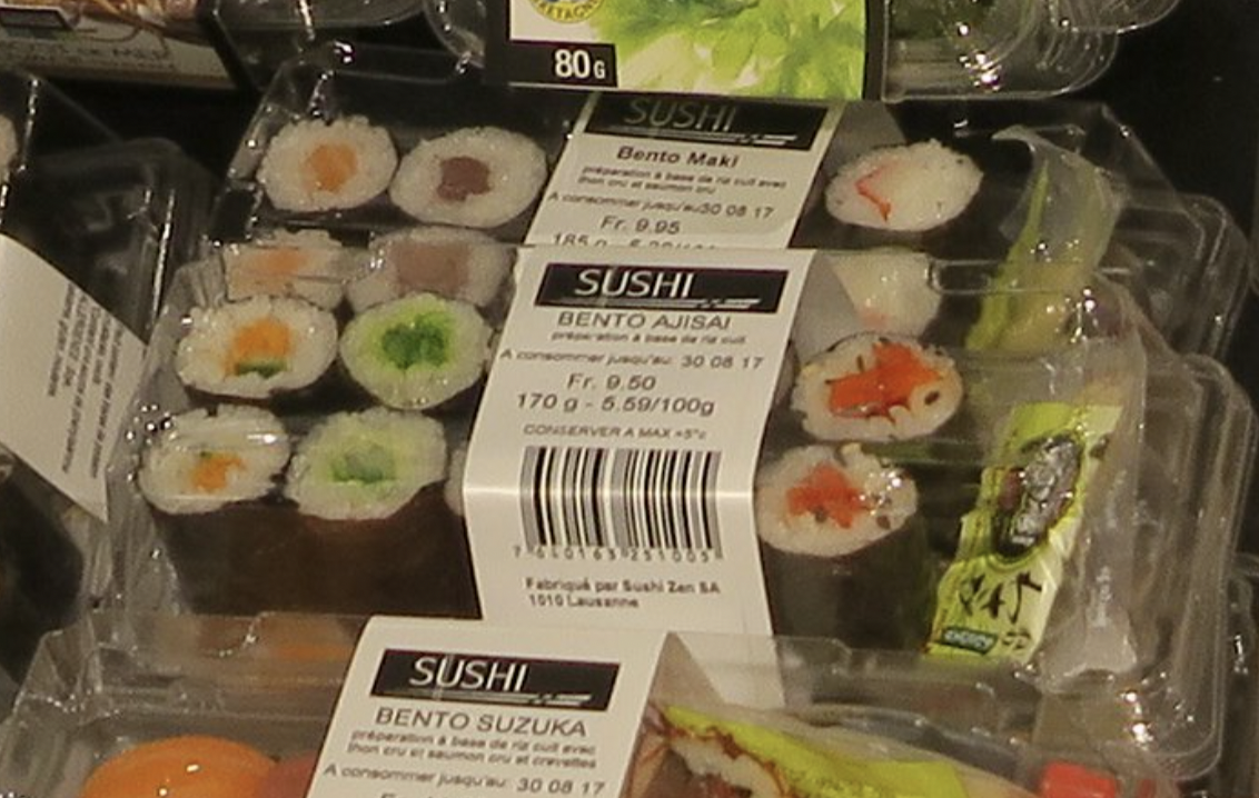 참치 롤초밥이라고 파는데, 그 안에 아보카도, 오이, 참치마요네즈에 버무린 거. 이렇게 세 개 넣으면 많이 들어 있는 거고, 보통은 연어하나 달랑, 오이하나 달랑 이렇게 넣고 작게 잘라서 한 조각 당 2~3프랑에 팝니다. 한 조각에 4천 원이란 얘기예요.