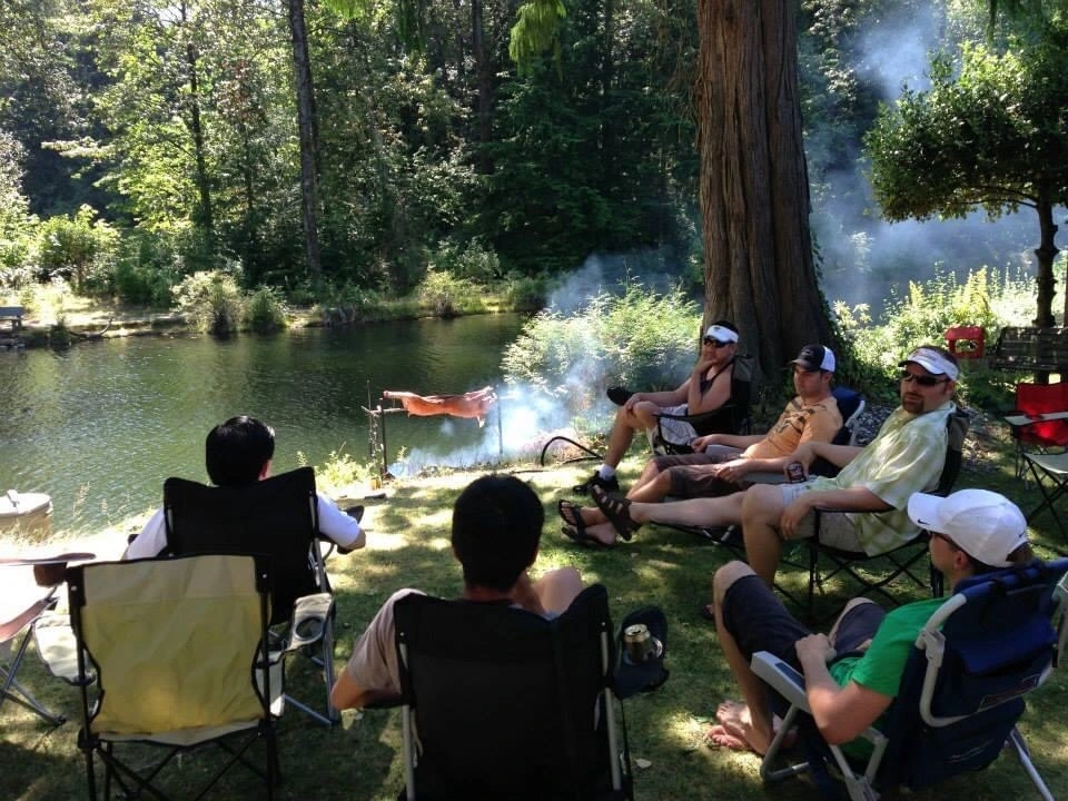 내가 돼지고기 없는 터키로 떠난 사이에 아들네서는 친구들이 모여 뒷마당에서 돼지 통구이를 했다.