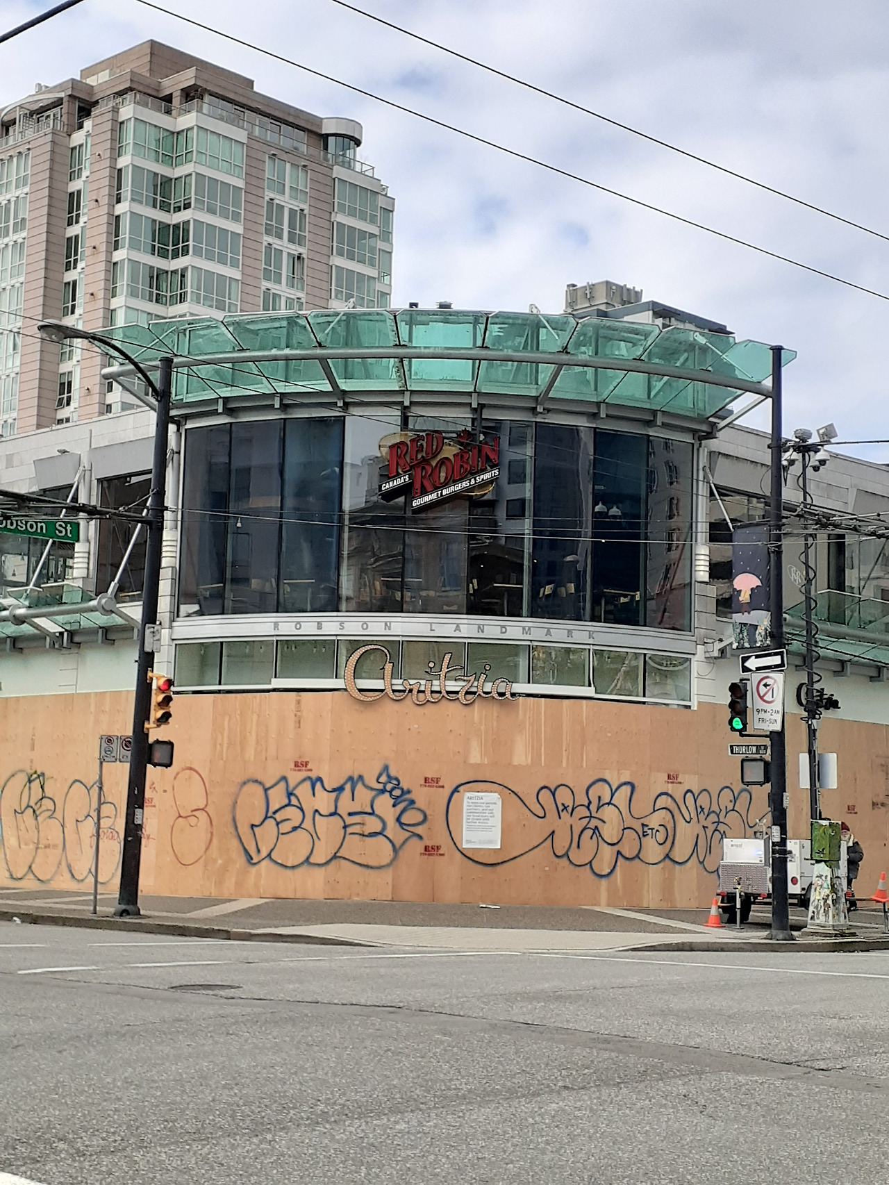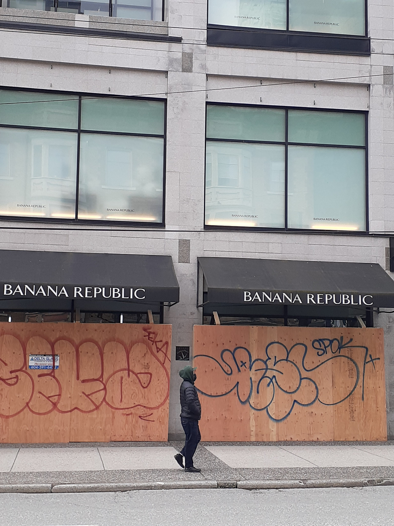 코로나 바이러스가 시작될 무렵에 다운타운을 간 적이 있었는데 명품점들은 쇼윈도나 출입문을 합판으로 다 막아 놓아서 마치 유령도시 같은 분위기가 났다. 밴쿠버의 다운타운이래 봤자 볼거리나 놀거리도 별로 없는데 구색으로 유명한 디자이너샵들이 몇 개 들어와 있을 뿐 진짜 심심했던 거리가 이제는 그야말로 무미건조하다 못해 황야처럼 변해버렸다. 가게 안의 물건들을 창고에 보관하려면 언제 끝날지도 모르는 채 별도의 비용을 감당해야 한다. 건물의 임대료와 창고 보관료를 이중으로 감당하는 리스크가 엄청나므로 물건을 그대로 가게에 두고 휴업을 하는 동안에 건물의 전면을 다 막아버리고 말았는지도 모른다.